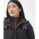 The Barbour Cannich Ladies Wax Jacket is a relaxed mid length parka inspired jacket with fishtail styling. Crafted from a quality waxed cotton outer with iconic Barbour tartan lining, and inner baffle quilted panels to provide superb warmth and insulation around your body. There is a detachable hood for added weather protection, welt pockets, gently shaped waist, and leather trim with classically style gold hardware.