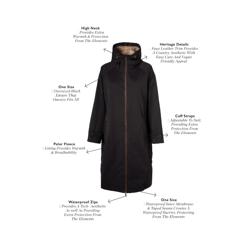 Constructed for the discerning adventurer, the Holland Cooper Ladies One-Size Waterproof Country Dry Coat features an oversized design and over-knee length for unparalleled coverage in all weather conditions. Boasting a waterproof outer shell fabric and fully taped waterproof seams, this coat offers ultimate protection. Its full zip closure and adjustable cuffs add practicality and versatility, while the borg-lined hood and welt pockets in the front elevate its functionality and comfort. Faux leather piping and subtle HC branding adds a touch of sophistication to this must-have piece.