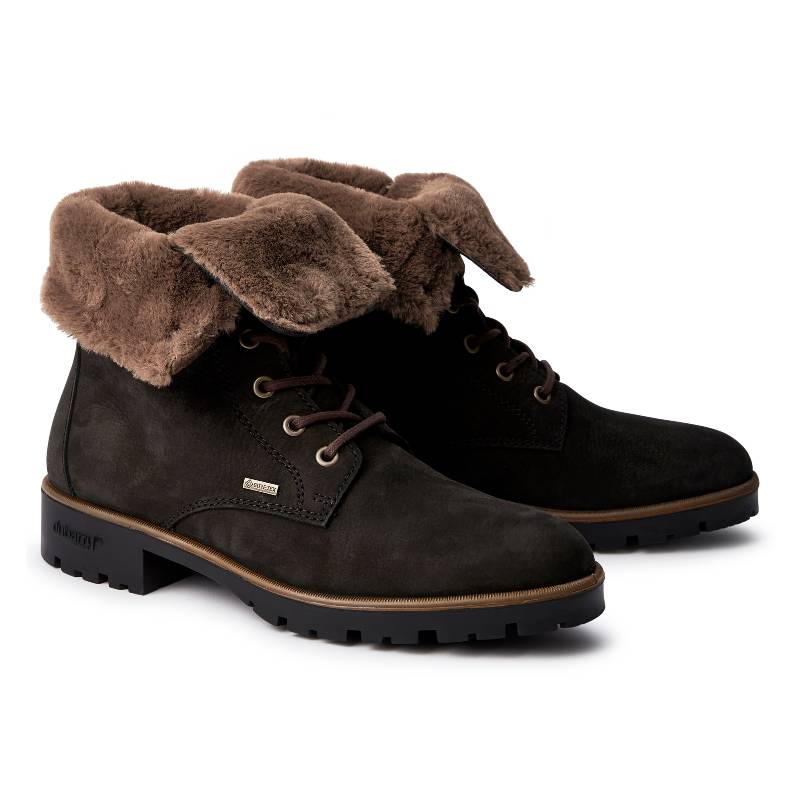 The Dubarry Glengarriff GORE-TEX Ladies Waterproof Ankle Boot offers comfort and traction in all weather conditions. They are crafted using the highest quality Dubarry's DryFast-Drysoft™ leather and suede, also lined with faux fur and GORE-TEX product technology for added warmth and waterproofing and breathability. Its padded collar and removable cushion footbed provide lasting comfort, and rustproof hardware ensure long-lasting durability. They feature a PU fill insole that provides superior shock absorbency and comfort, while an outer sole offers strong grip and traction in wet and slippery conditions. Enjoy a custom fit with fold-down or lace-up options.