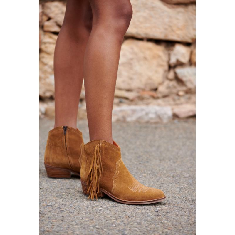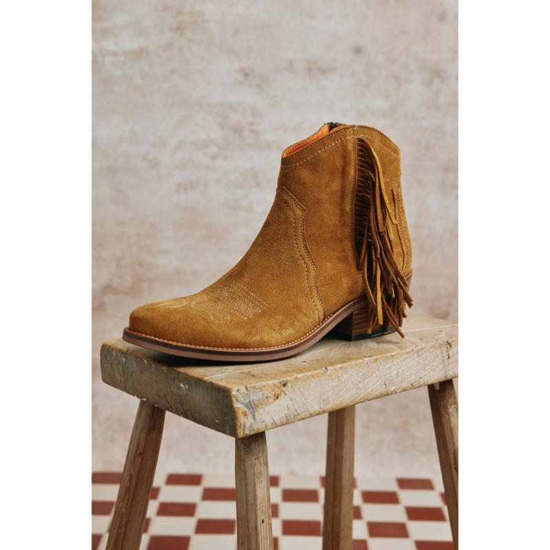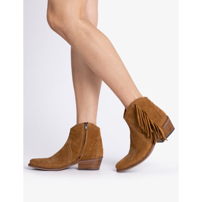 The Penelope Chilvers Betty Fringe Ladies Suede Boot in Tan is a timeless and playful addition to your footwear collection. Crafted from soft Spanish suede, it features a low Cuban heel and inside zip for a comfortable fit. With tonal stitching and a classic front seam, this western-inspired boot is expertly made in Spain. Perfect for pairing with denim or boho dresses.