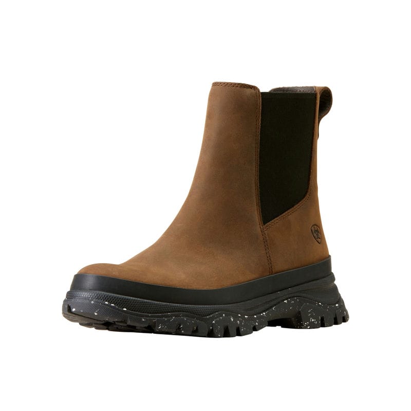 Experience all-day comfort and protection in the Ariat Moresby Boot, made from full grain leather with a DRYShield™ waterproof and breathable membrane to keep feet dry. This stylish Chelsea-style boot is equipped with a contoured insole for cushioning, a recycled polyester lining, and an EVA midsole. The Earth-friendly recycled speckled rubber outsole is made from 50% or more sustainably sourced materials as part of Ariat's Eco range.