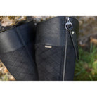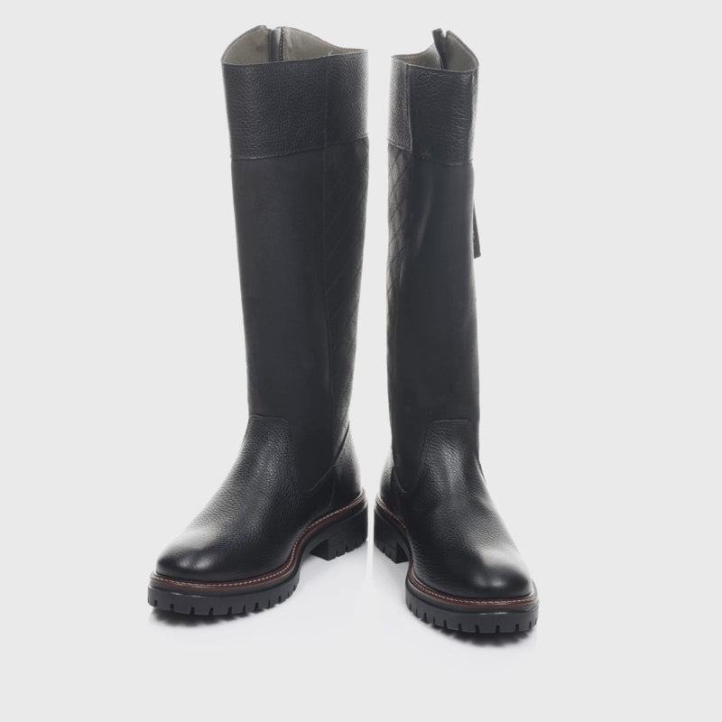 Introducing the Barbour Ingrid Tall Ladies Boot in black. Crafted with a premium leather and suede upper, this tall boot offers a stylish and sophisticated look. The diamond quilted design to the back of the suede, and the full-grained leather details, add luxurious touches. This boot is equipped with a full-length zip and complete with tassel detailing, providing convenient access for easy on and off, and a chunky cleated sole for added comfort and durability, perfect for all day wearing.