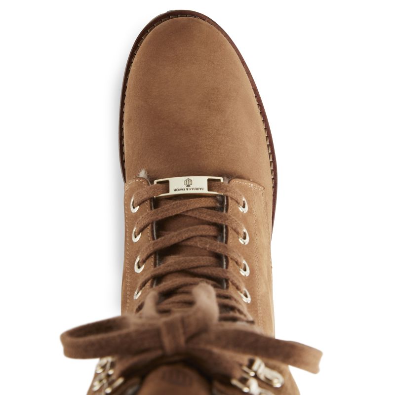 The Fairfax & Favor Anglesey Ladies Shearling Lined Boot wouldn't look out of place on either the pavements in town or the paths of the countryside and is a must for anyone who loves rural chic. Decked in a nubuck outer with suede trim, these lace-up boots feature a dependable outdoor tread and a memory foam comfort insole for added security and support. An inside zip ensures ease of wear, while there are a host of stylish details, including branded gold lace ends, a gold lace tab and signature branded hardware.
