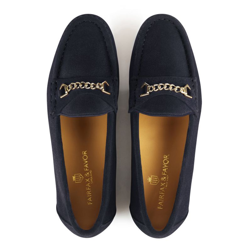 Fairfax & Favor's Apsley Suede Loafers can be easily characterised by its neat silhouette, chic gold chain and almond toe styling. Crafted from premium suede and features a padded comfort insole, practical composite leather and rubber outsole and stylish 2cm heel. An elegant addition to everyday wear.