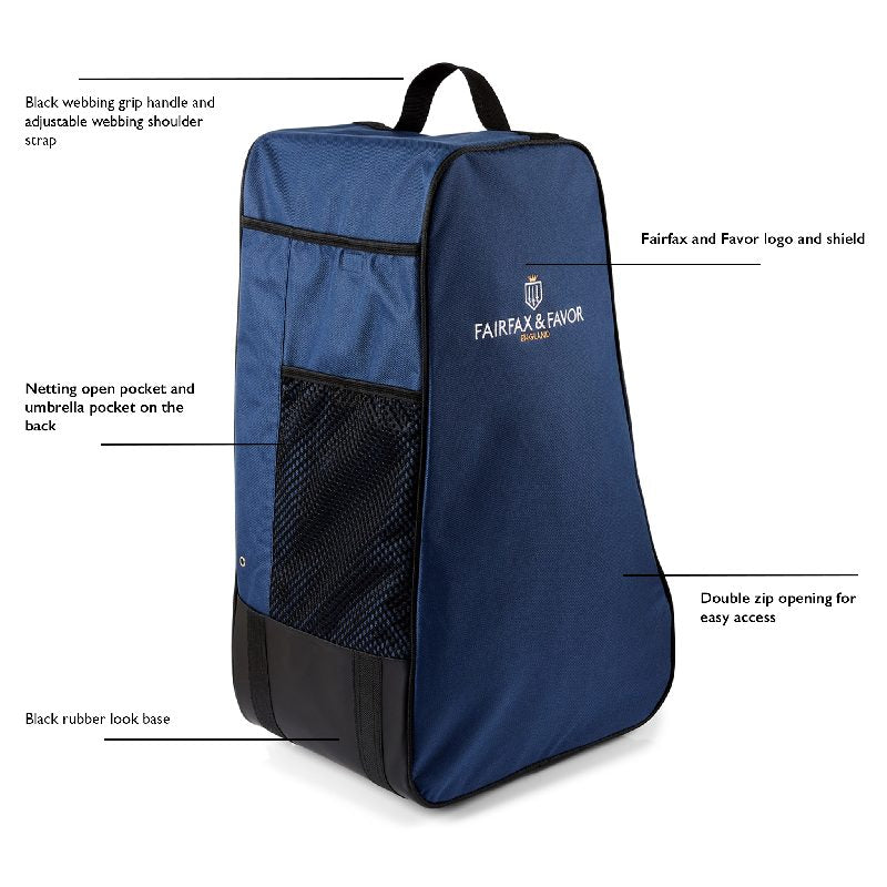 The Fairfax & Favor Boot Bag is a stylish and practical accessory, designed to keep your boots clean, dry, and protected. Crafted from polyester with a rubber-like base, this elegant boot bag features the signature F&F shield logo embroidery. Both breathable and lightweight, this bag is ideal for transporting your boots and the additional pockets are perfect for storing your footwear accessories such as Fairfax & Favor tassels! Complete with an ergonomic double zip, carry handle, and adjustable shoulder strap.