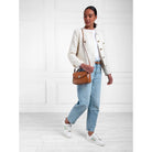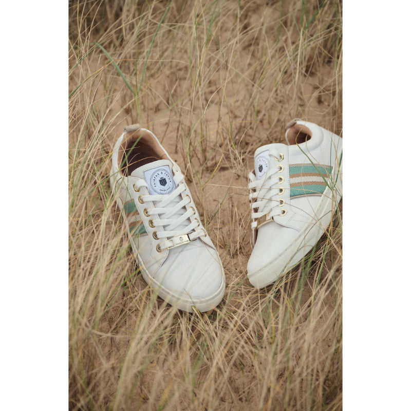 The Fairfax & Favor Boston Ladies Leather Trainer is a chic and casual option for sunny summer days. Featuring a lovely white mint stone striped webbing, these trainers bring a pop of colour to any outfit. A perfect choice for festivals, beach days, or strolling on the boardwalk. Pair with a floaty maxi dress or shorts and complete the look with the matching Boston collection.