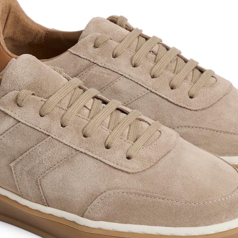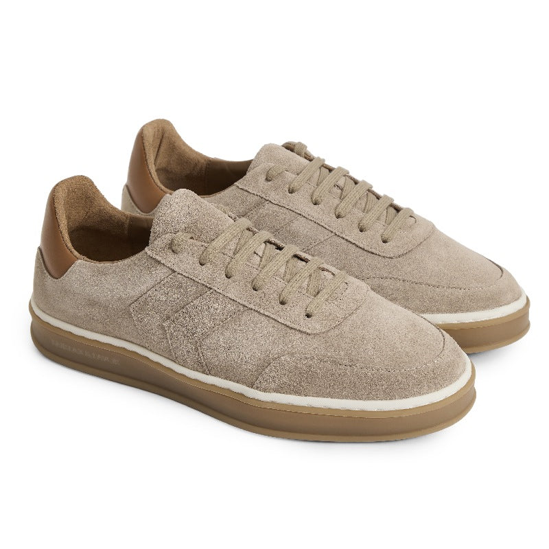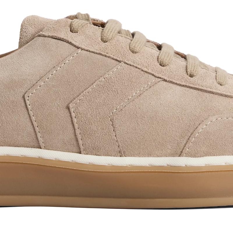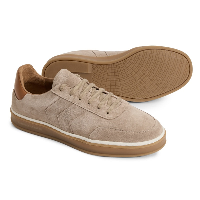 Relaxed and modern, the Kendrick Trainer brings effortless style to your everyday rotation. Crafted from soft suede with tonal chevron detailing, smooth leather trims and matching laces, this Portuguese-made trainer balances understated design with thoughtful construction. The gum sole, rounded toe and padded leather-lined footbed deliver all-day comfort, while minimal branding—a subtle sole detail and discreet gold foiled logo—keeps the focus on quality craftsmanship. Versatile enough to complement your entire casual wardrobe, it's refined simplicity at its finest.