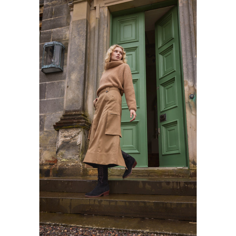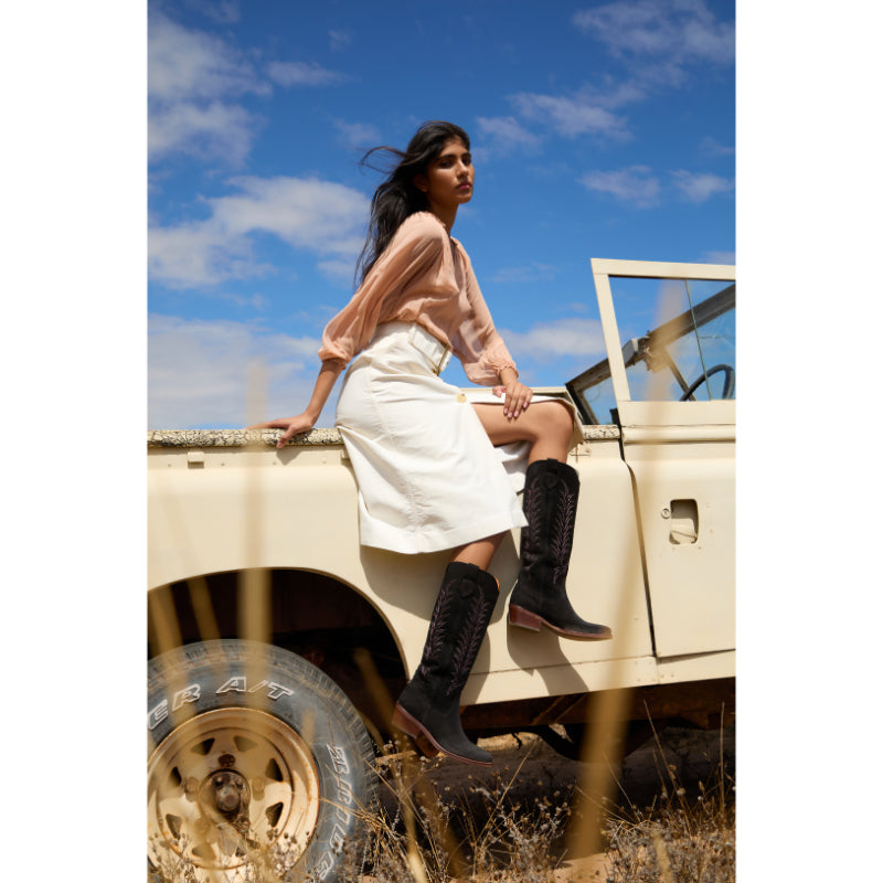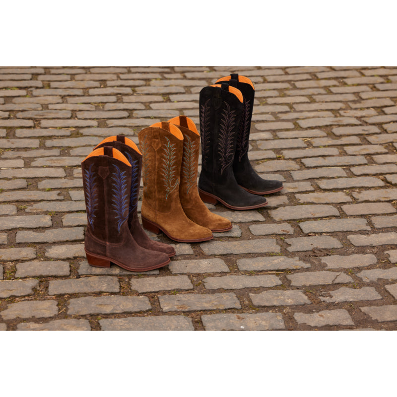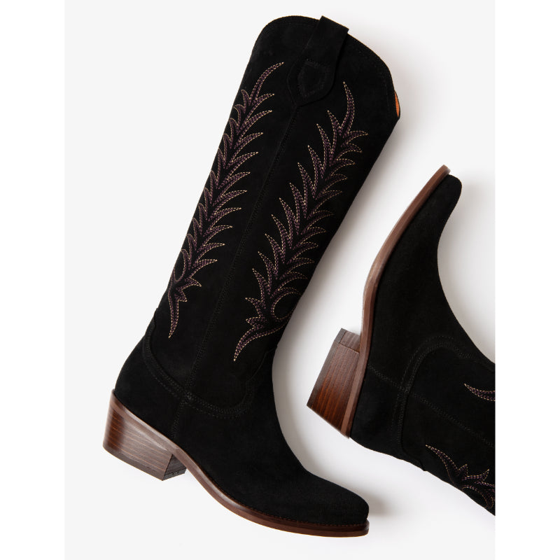 Upgrade your western-inspired wardrobe with the Penelope Chilvers Blanca Embroidered Suede Ladies Cowboy Boot. This long length boot, handcrafted in black suede, is adorned with Penelope Chilvers signature cactus 2-tone embroidery. With a low mid Cuban heel, this flattering and true-to-size boot is perfect for any occasion, from crisp winter days to spring outings. A must-have for fans of the, Goldie, or Cassidy styles.