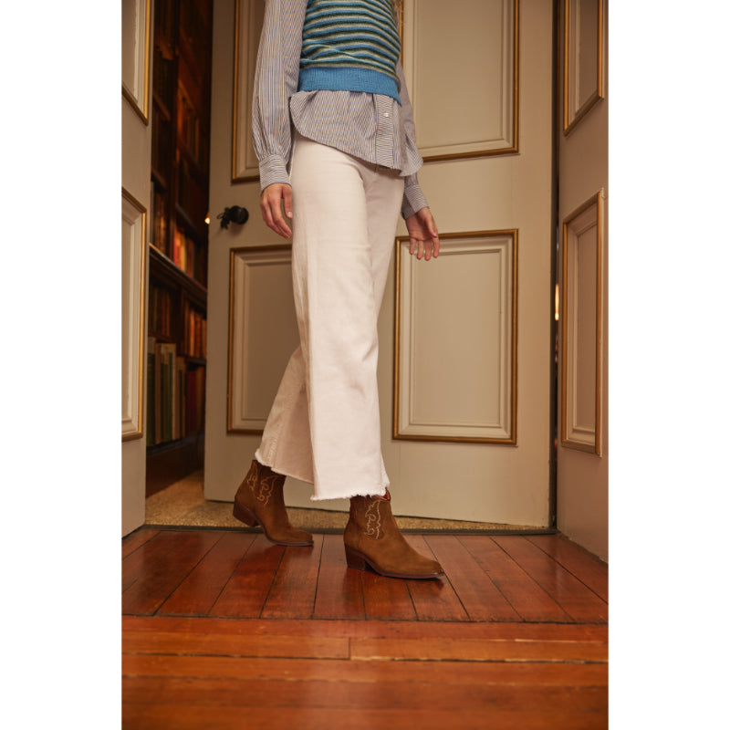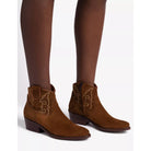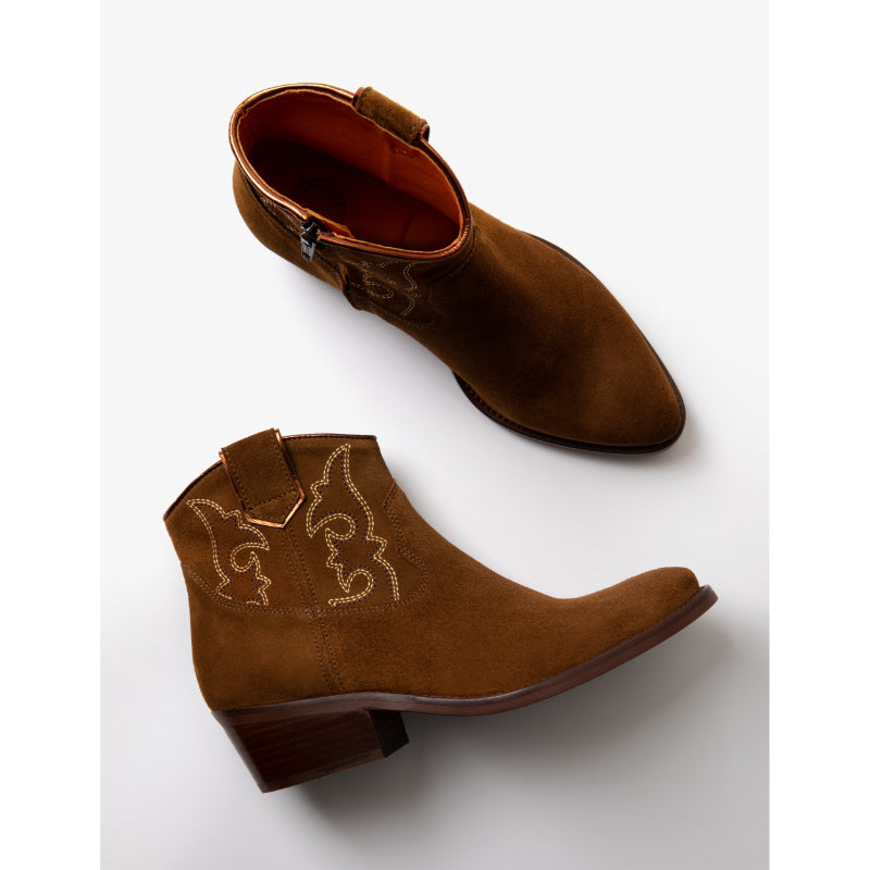 Introducing the Penelope Chilvers Cassidy Suede Dove Embroidered Ladies Boot. Made with soft, structured suede and complete with authentic western hand stitching. This western-inspired ankle boot features a low Cuban heel and inside zip for a comfortable and easy fit. The perfect autumnal transitional boot.