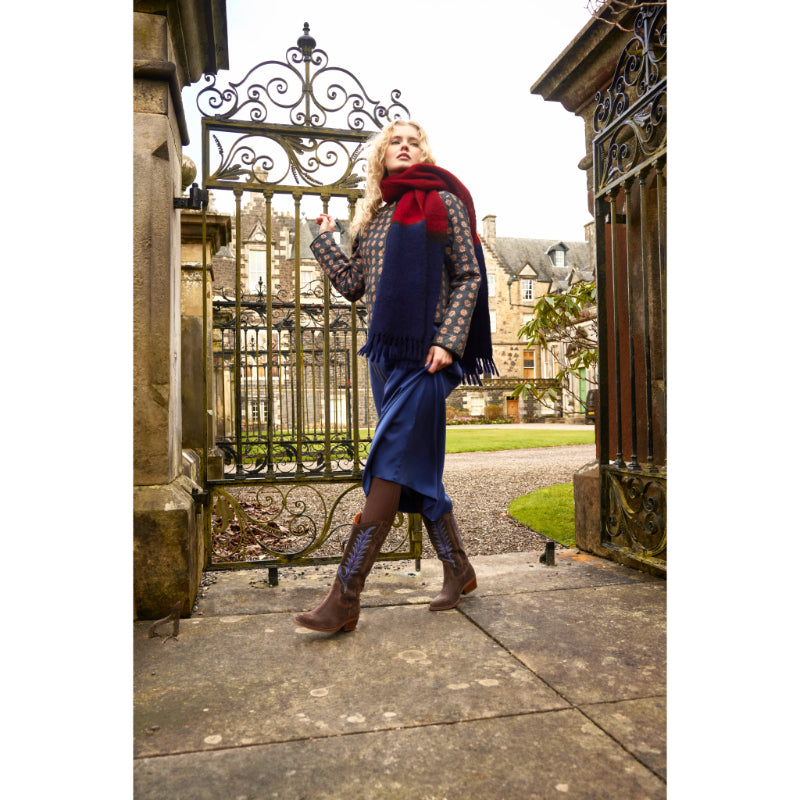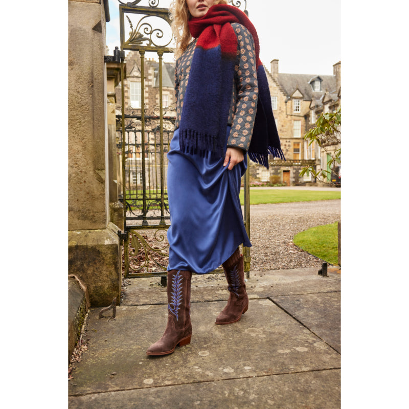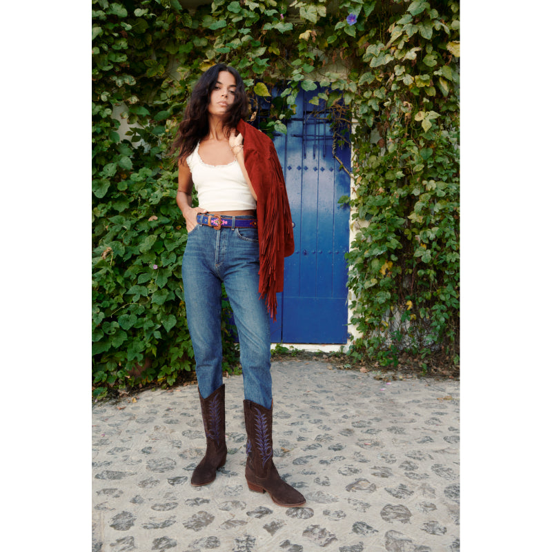 Step into timeless style with the Penelope Chilvers Goldie Embroidered Suede Ladies Cowboy Boot. Featuring authentic Western embroidery in colored triple stitch, this boot has a slim fit with a distinctive cowboy silhouette and Cuban heel. Finished in luxurious Italian suede, this high midcalf boot offers impeccable style and attitude.