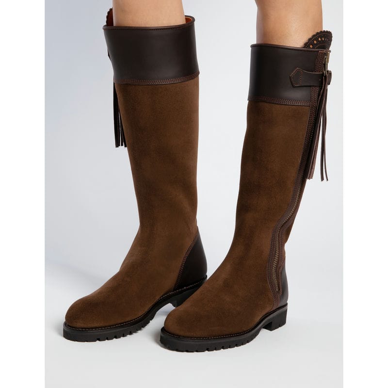 The Penelope Chilvers Inclement Long Tassel Ladies Weatherproof Boot perfectly blends style with practicality, meaning you can look your best wherever your countryside adventures take you. The sustainably sourced oiled suede outer is Scotchgard treated, making it weatherproof and water resistant, whilst the Texalive membrane offers water resistance, warmth and breathability. The outer is complete with smart vegetable-dyed leather panels and matching handcrafted tassels, with a protective inner gusset and scalloped detailing around the zip panel. Featuring a Goodyear welted sole, that offers ventilation and superb durability, with rubber tread and an internal cork layer that moulds to your foot shape for comfort and support. These boots are not only beautiful, cut in a sleek and stylish contouring fit, but are also highly technical and ideal for the active country lady.