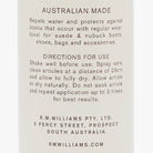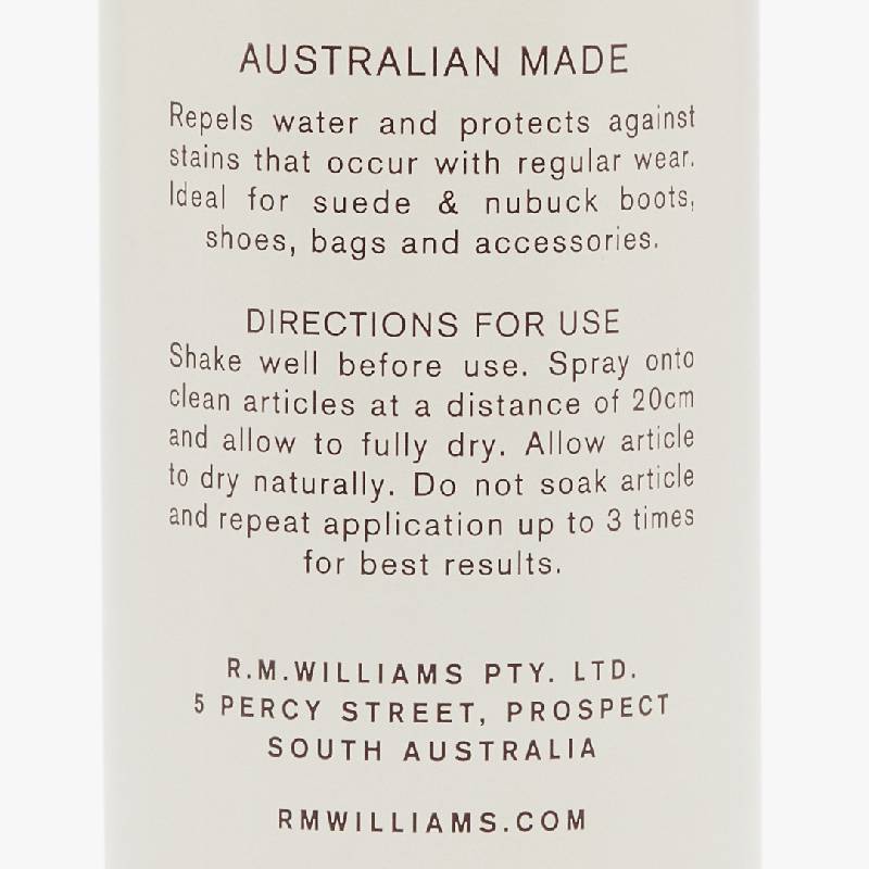 The R.M. Williams Suede Protector is made in Australia, designed to protect leather, suede, nubuck and most other fabrics. It repels water and helps protect against stains from regular wear. Spray onto clean article at a distance of 20cm and allow to fully dry.