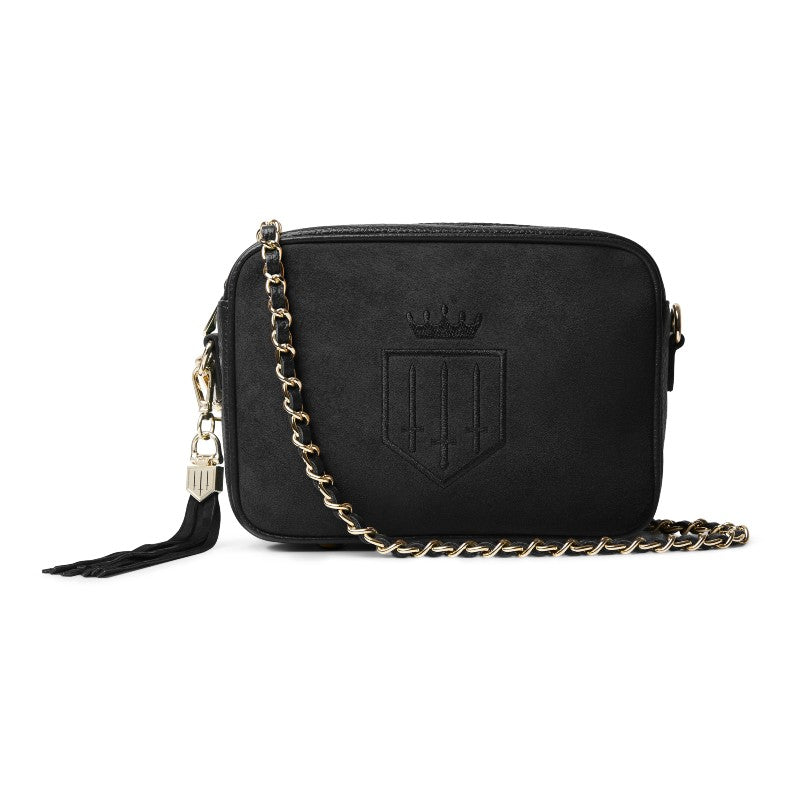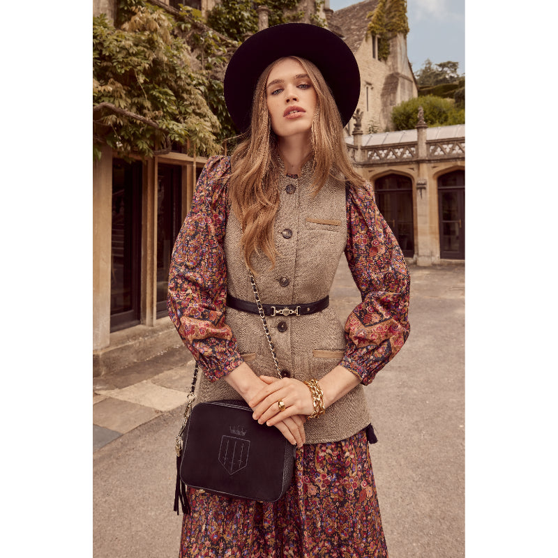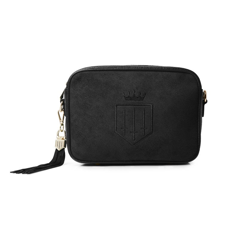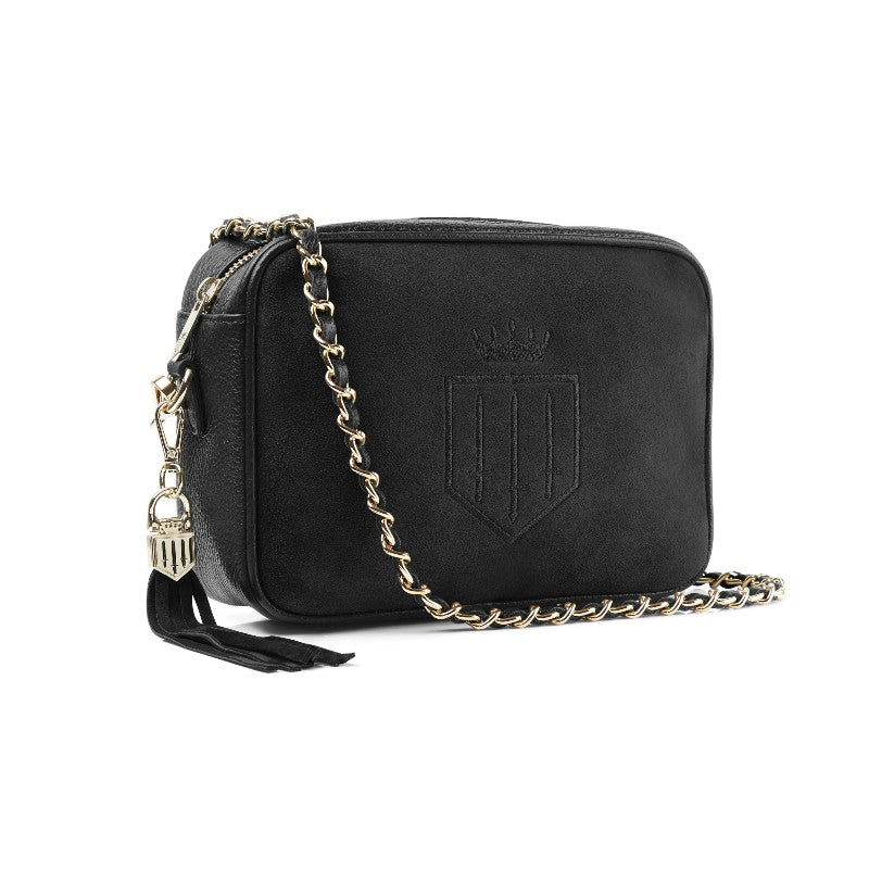 The Fairfax & Favor Finsbury Ladies Shoulder Bag is both stylish and superbly practical, an easy to wear option for when you're on the go. Crafted from luxurious suede and leather in a versatile size, big enough to fit all of your essentials with a top zip closure for security. The iconic Fairfax & Favor shield takes centre stage, embroidered onto the front of the bag with matching detachable suede tassel. The useful gold chain and leather strap allows you to wear the Finsbury over your shoulder or as a cross body bag, or even as a clutch as the strap is fully detachable. Featuring a large internal compartment, zipped internal pocket and chevron cut back pocket.