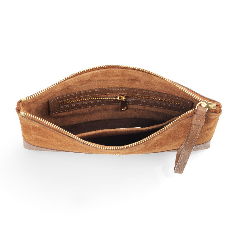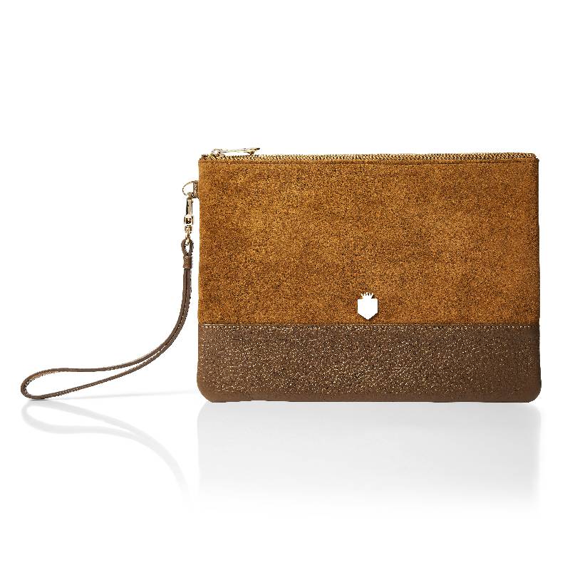 The Highbury Clutch Bag from Fairfax & Favor is an updated version of the signature Salisbury. Crafted from luxuriously soft suede combined with a full grain leather base for a quality look and feel, and added durability. The handy size is perfectly suited for your essentials and comfortably fits an iPhone, whilst retaining an elegant shape. Features include a detachable leather wrist strap, branded zip pull, signature gold plated shield and rear embossed gold logo.