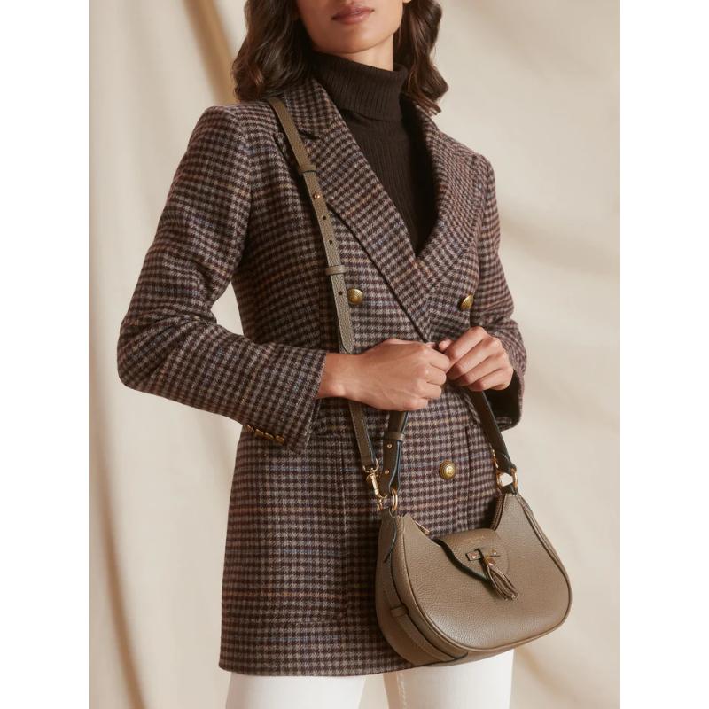 The Fairfax & Favor Windsor Ladies Leather Shoulder Bag combines classic design with expert craftsmanship. Its compact crescent shape is thoughtfully detailed with a mini tassel and polished light gold hardware, including signature Sam Browne fastenings on the handle. Handcrafted from premium pebbled leather, it features a gold-foiled logo and subtle chevron accent on the back. The bag’s main compartment, internal zipped pocket, and detachable crossbody strap ensure both style and practicality for everyday elegance.
