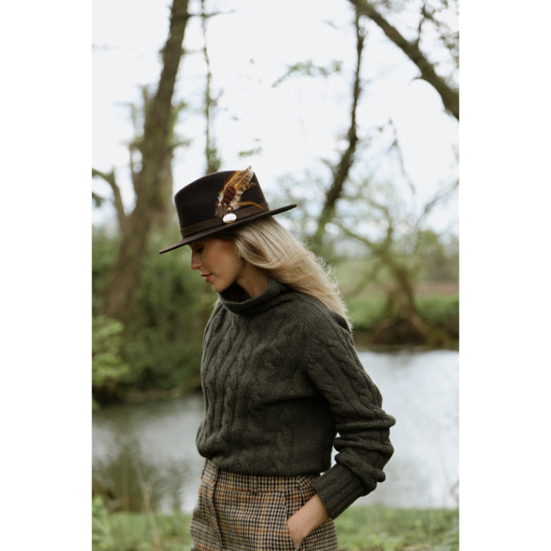 The Hicks & Brown Suffolk Gamebird Fedora Hat is a sophisticated wool felt water resistant hat. Displaying an individual cluster of natural game bird feathers fastened behind a tan band and featuring Hicks & Browns signature pin tab. Made in England and as each is unique, feather colours may vary slightly.