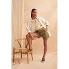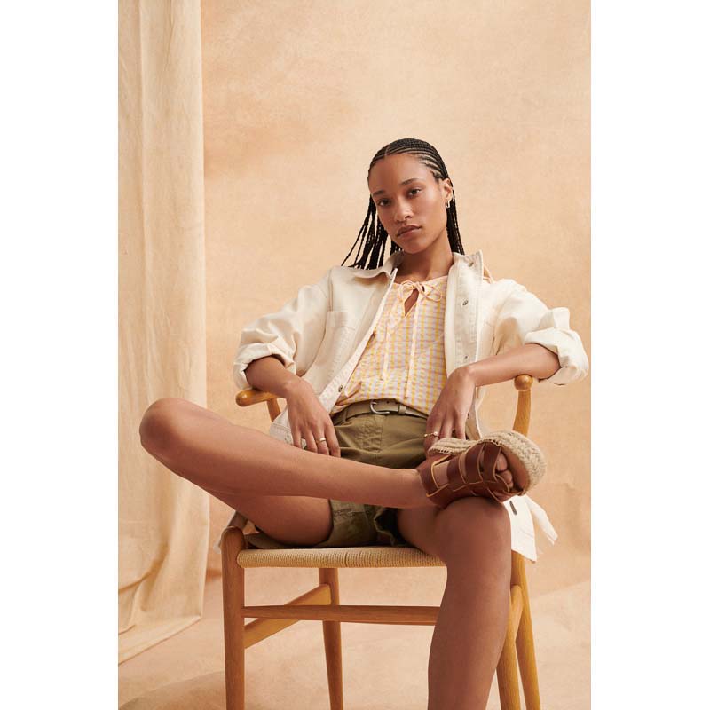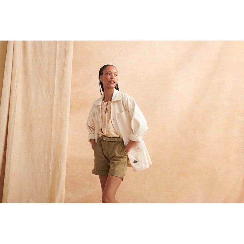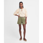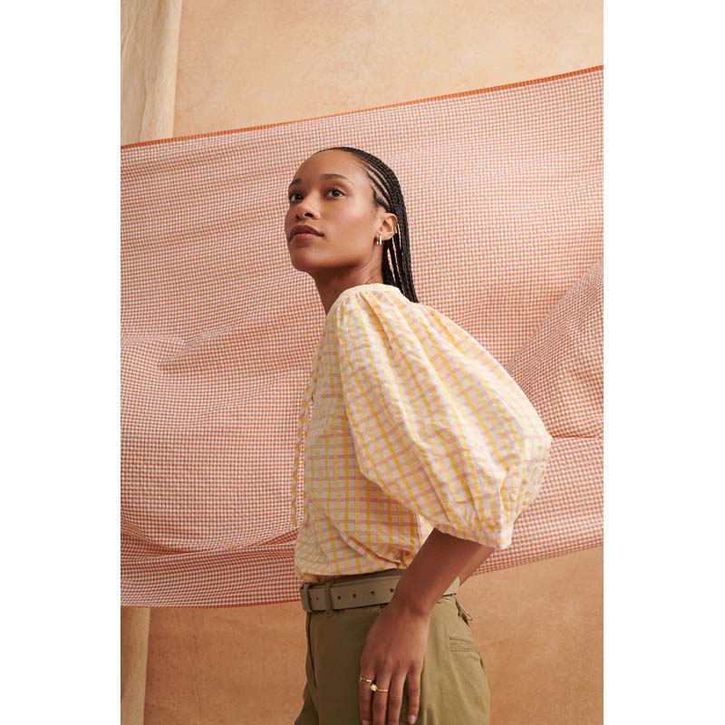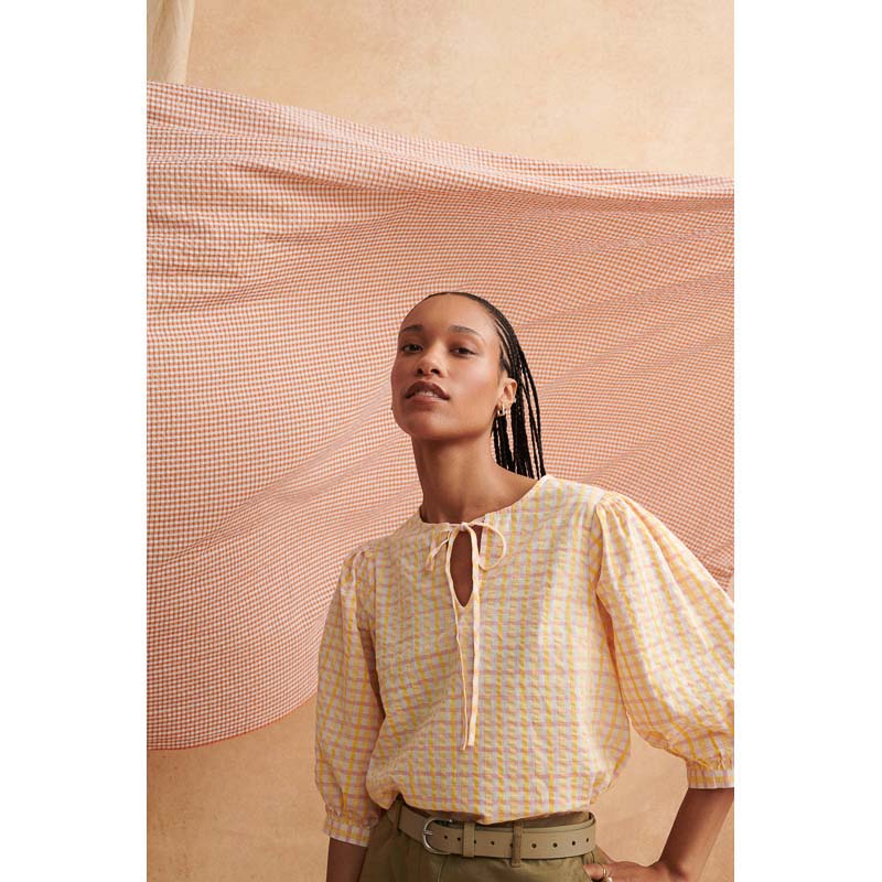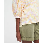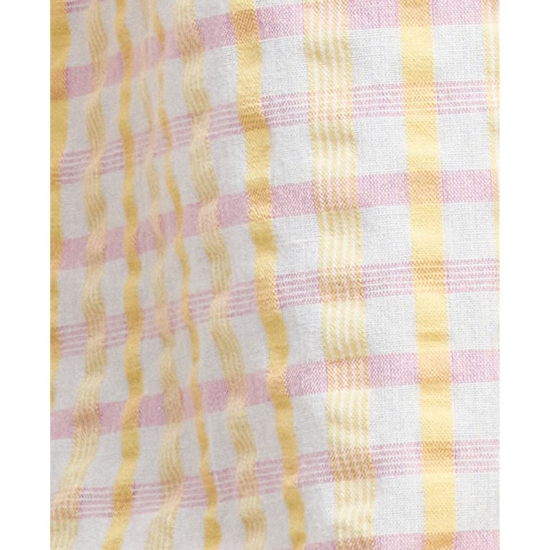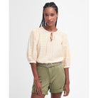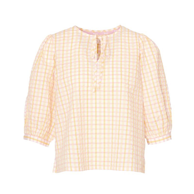 This Barbour Belmont Ladies Shirt is expertly crafted from seersucker fabric to create a lightweight and airy top with a timeless checked pattern. Featuring notch neck opening with self-fabric ties, puff sleeves with key hole opening and classy pearl-like buttons to fasten, as well as coastal text tape trim for a subtle touch of style.