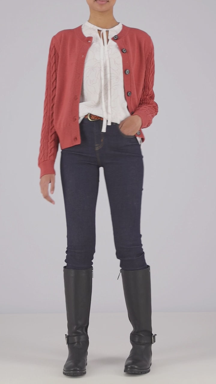 The Daphne Ladies Knit Cardigan from Barbour is a beautiful layering piece, suitable for any season and almost any occasion. The soft cotton composition is cosy yet breathable, crafted with a plain knit body and cable knit sleeves. There is a flattering round neckline, ribbed cuffs, and hem, and complete with Barbour branded buttons. Pair with a smart blouse, casual tee, or anything in between.