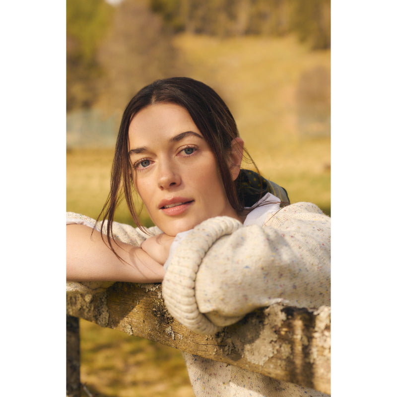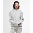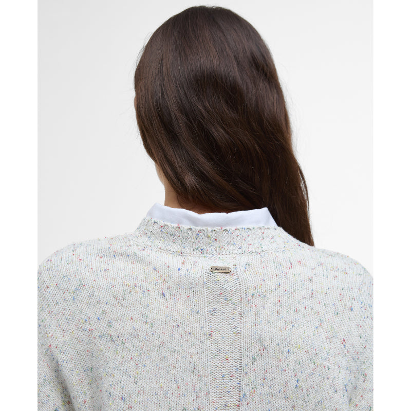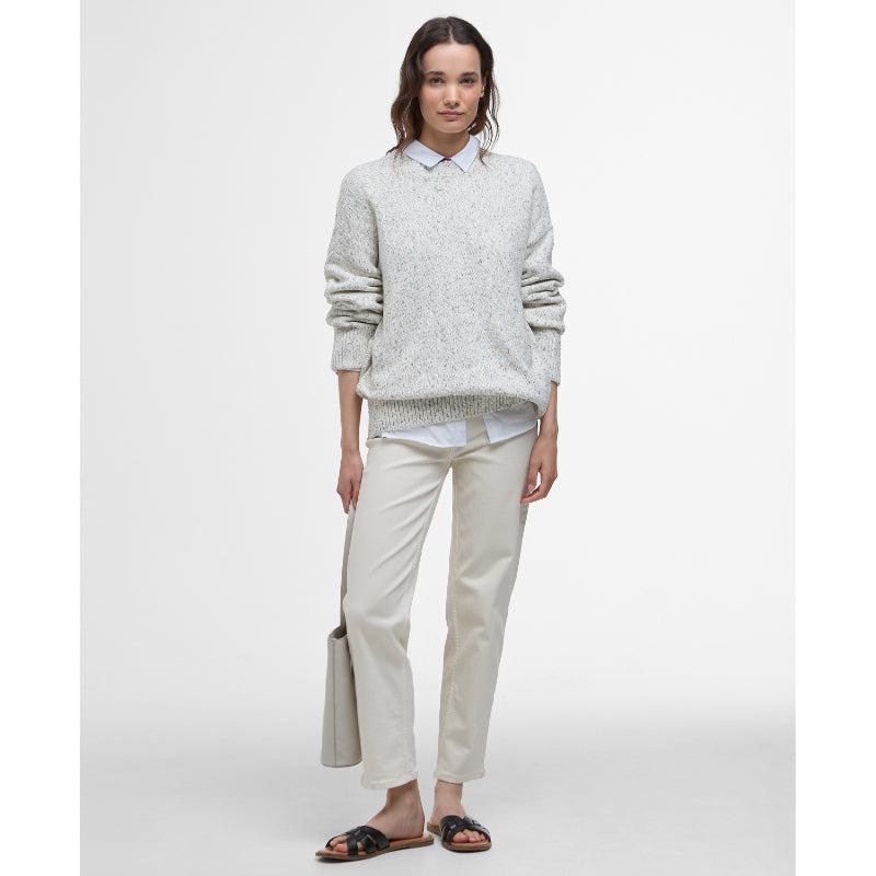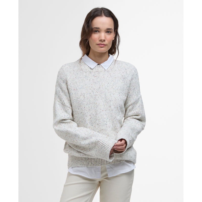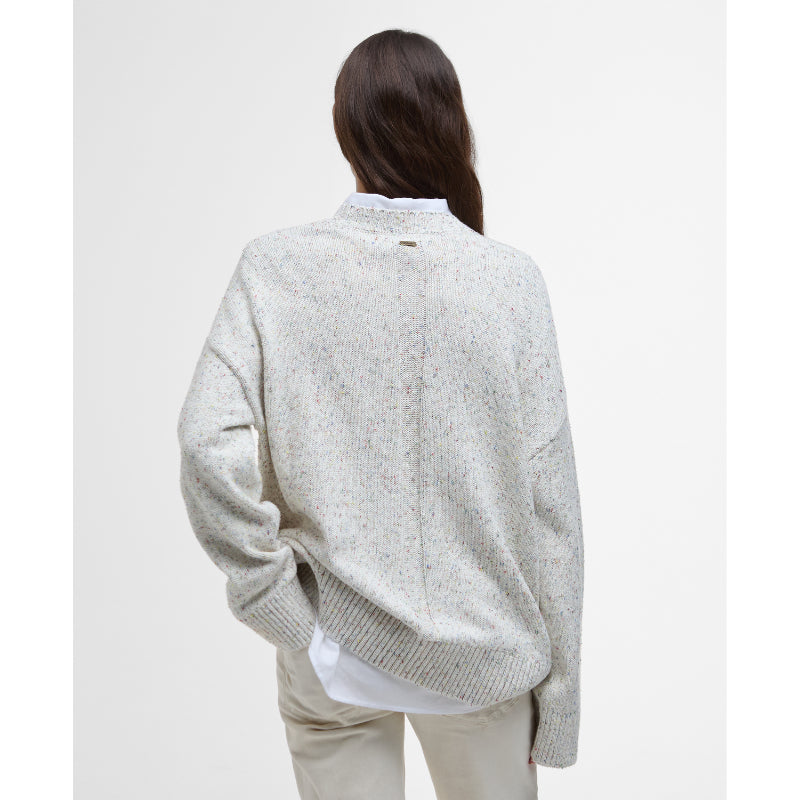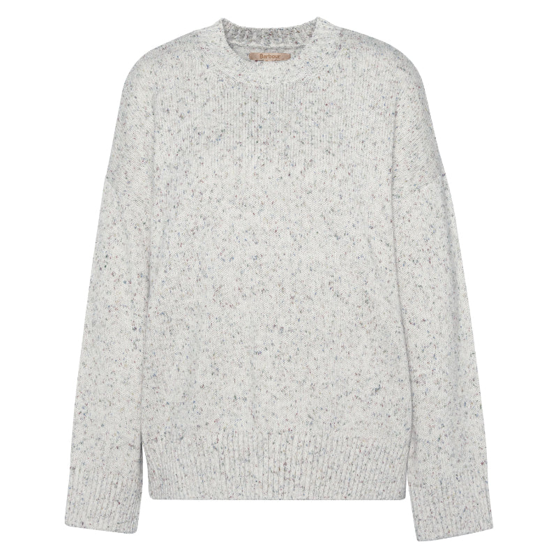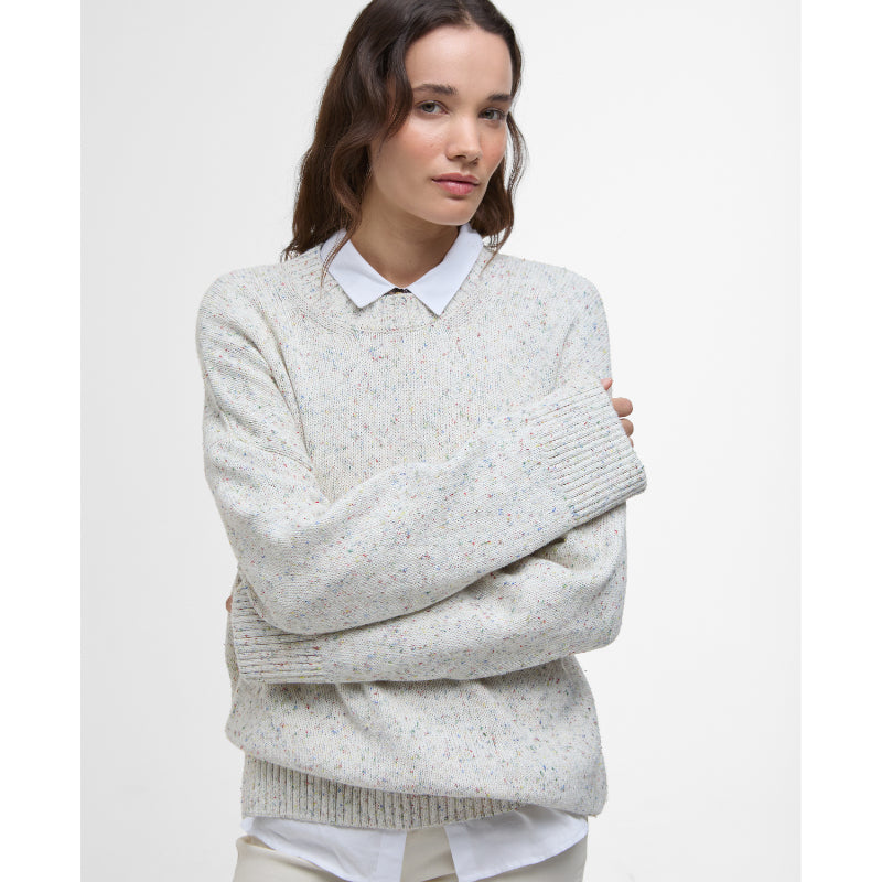 Expertly crafted in a luxurious cotton blend neppy yarn, the Barbour Edda Ladies Knitted Crew Neck Jumper elevates any outfit with its stylish drop shoulder design and unique reverse knit stripe at the centre back. The oversized fit and rib trims not only provide comfort, but also add a touche of elegance to this crew neck jumper. Experience the perfect blend of fashion and function with this must-have piece.