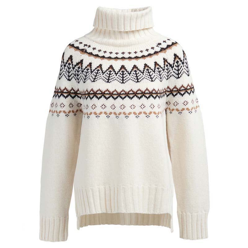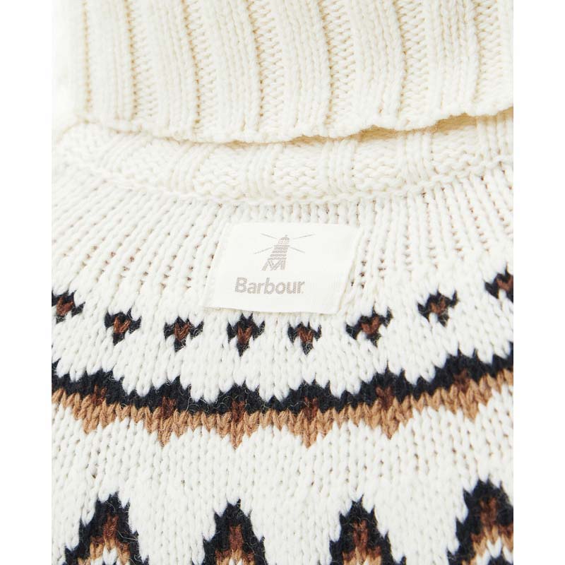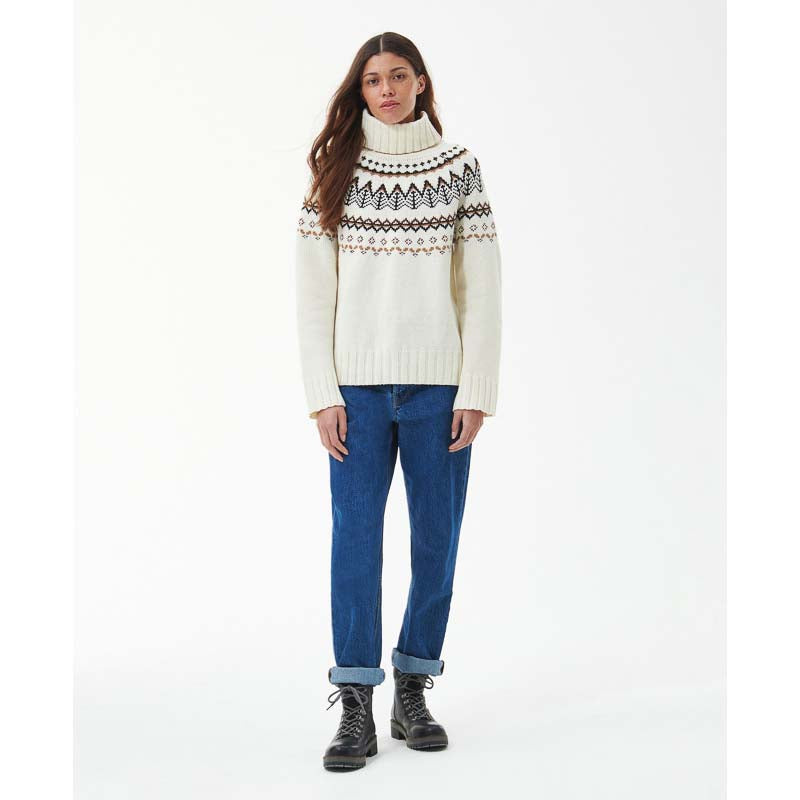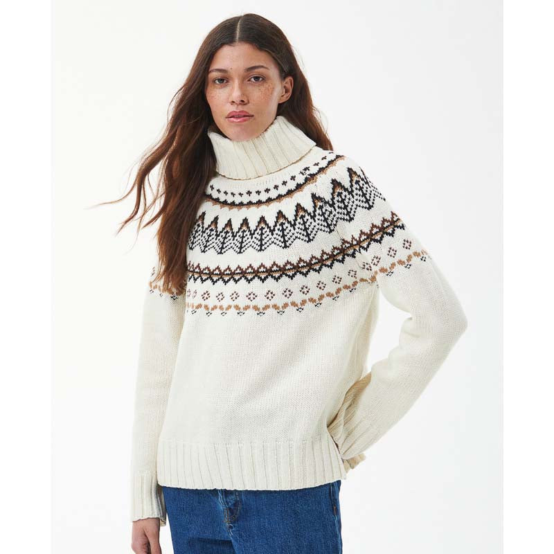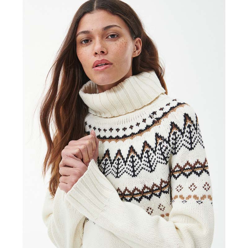 Stay warm in style with the Barbour Mersea Ladies Knit. This ladies jumper features a cosy wool-rich blend to provide superior warmth during cooler weather and a charming fairisle design. Raglan sleeves and a chunky funnel neck make it perfect for layering over leggings or jeans, while a stepped hem adds a touch of modernity. The woven ID patch at the nape of the neck confirms its premium quality.