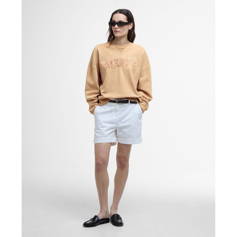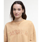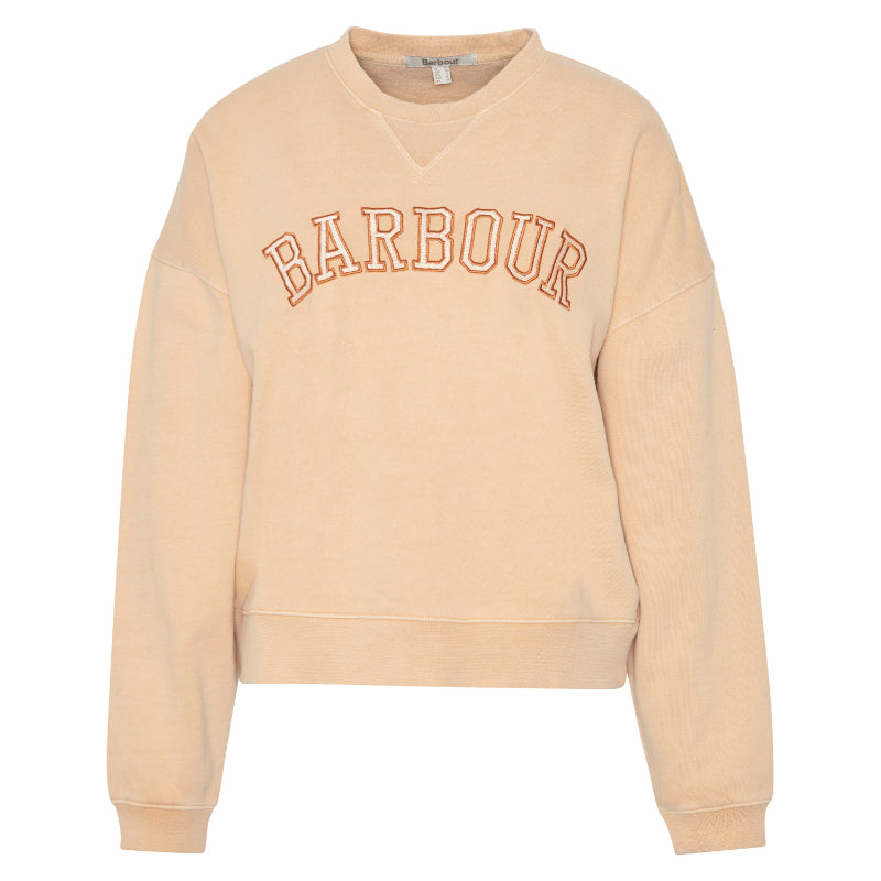The Barbour Millie Ladies Sweatshirt in Toast offers a relaxed fit and comfortable terra dye fabric. With a dropped shoulder and rib neckline, cuffs, and hem, this sweatshirt is both stylish and cozy. Complete with Barbour varsity embroidery on the centre front, it's the perfect addition to any wardrobe. Embrace comfort and style with this must-have sweatshirt.