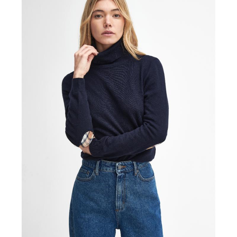 Elevate your winter wardrobe with our Barbour Pendle Roll Collar Knitted Ladies Jumper. This sweater boasts a neat fit and a stylish roll collar, perfect for keeping you warm and chic. Featuring the iconic Barbour seasonal tartan trim on the elbow patches, it's the perfect blend of fashion and functionality. Enhance your winter wardrobe with this exceptional layering piece.