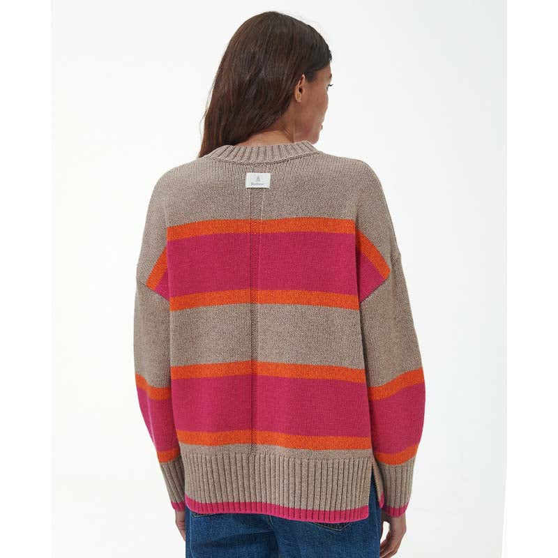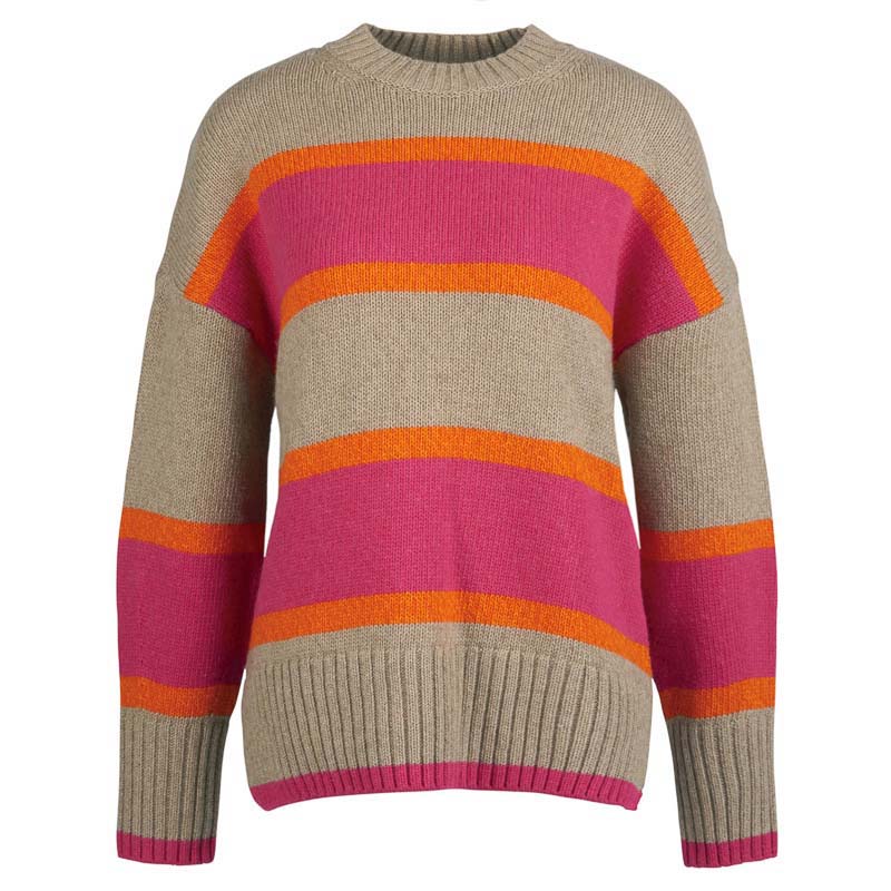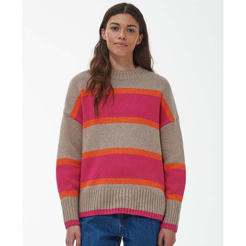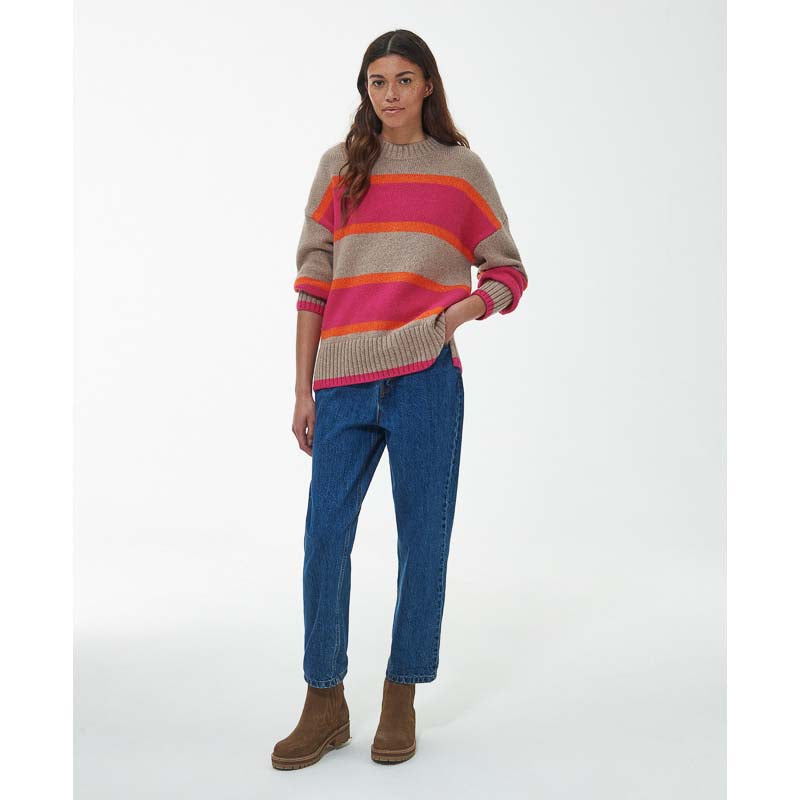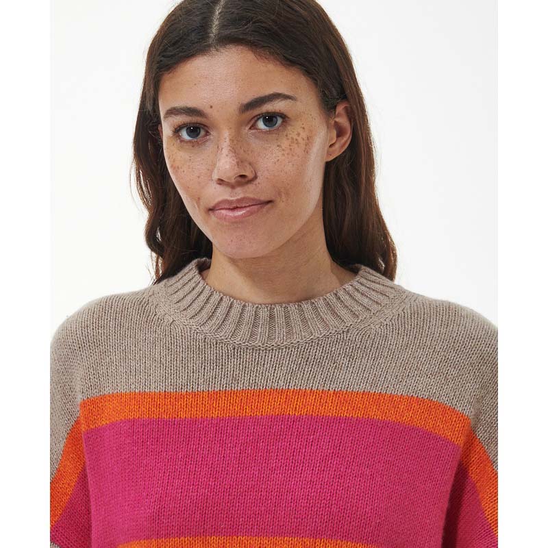 This Barbour Samphire Ladies Knit Jumper is a perfect essential for your wardrobe. Fashioned using a cotton and wool blend, it's durable and comfy, with a mid-weight warmth and a contemporary fit. The bold stripe pattern and trim at the hem and cuffs create a striking, fashionable appearance, complemented by a crew neck, lowcut armhole, and deep ribbing.