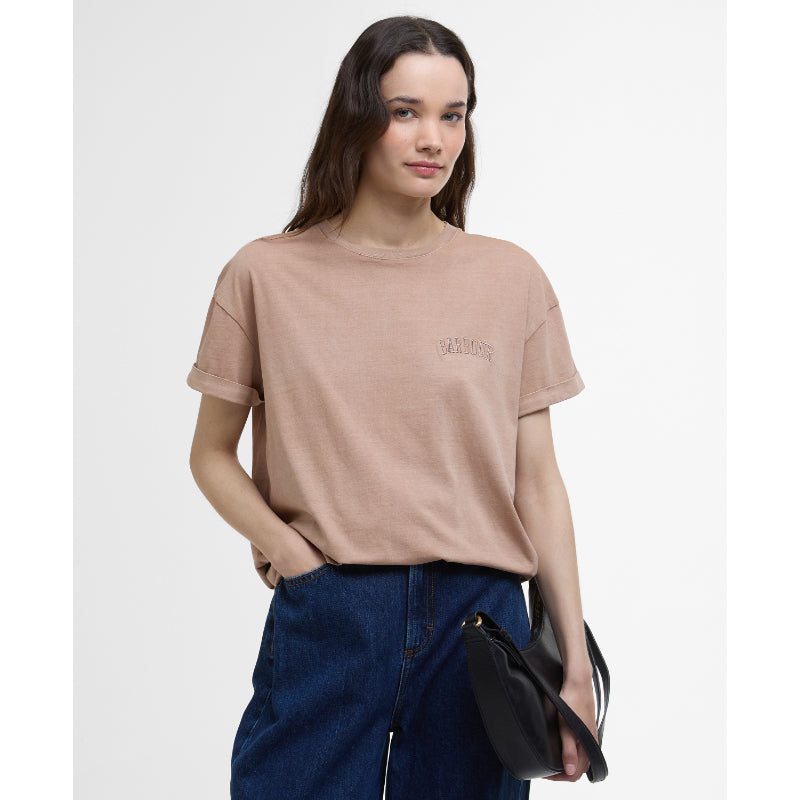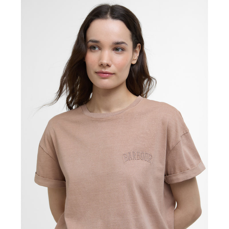This Barbour Sandgate Ladies T-shirt is made of quality cotton, with a Terra dye wash for a unique, stylish look. Featuring dropped armholes and a Barbour branding embroidered on the left chest, this T-shirt is perfect for casual wear.