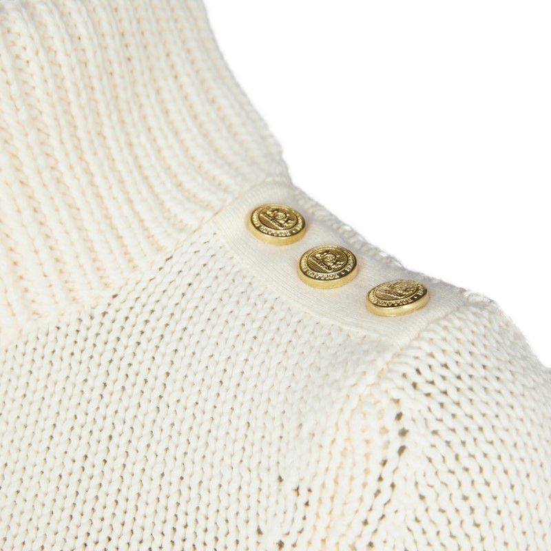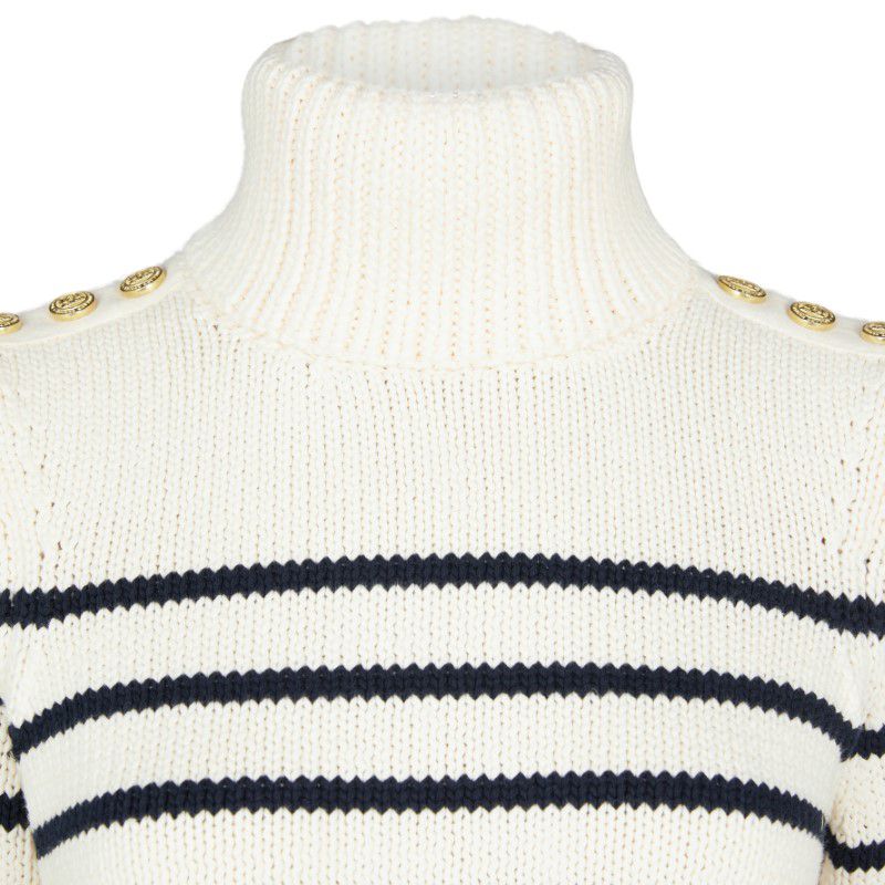 The Holland Cooper Henley Striped Ladies Roll Neck Jumper combines the classic, easy-to-wear style of the Breton stripe with the cosiness of a chunky roll neck... the perfect combination of casual chic. Crafted from a soft cotton, blended for durability, with ribbed cuffs and hem and adorned with Holland Cooper's signature gold hardware to the shoulder and sleeves. Pair with HC jeans and Chelsea boots for the ultimate weekend outfit.