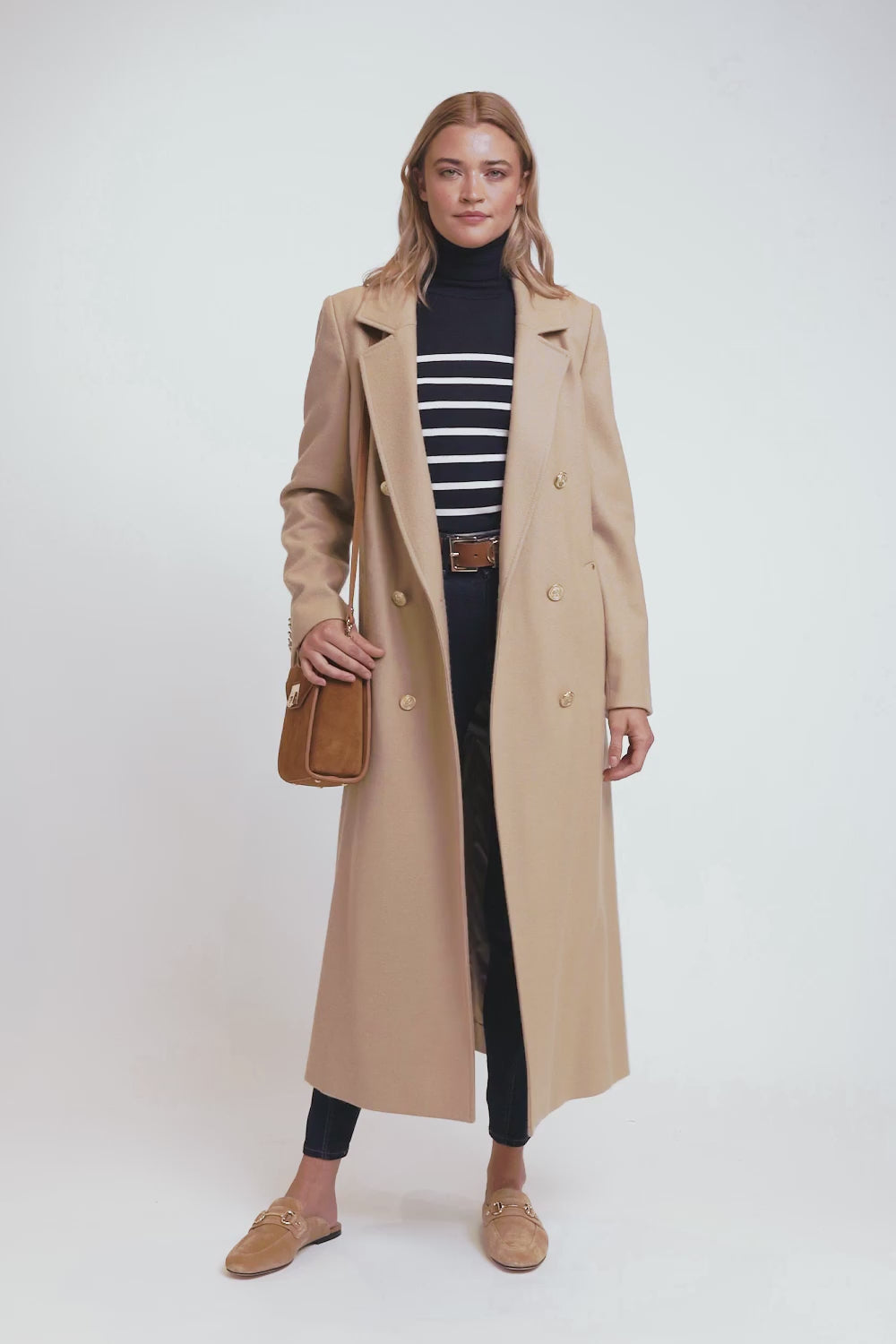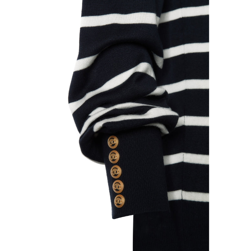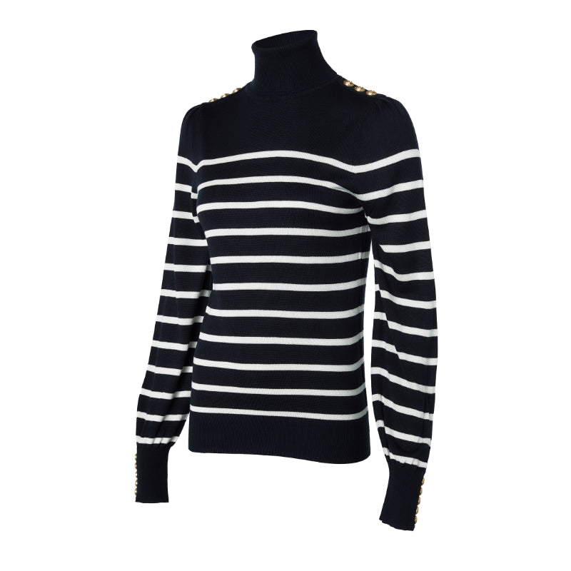 Experience luxurious comfort and effortless style with the Holland Cooper Kelsie Roll Neck Ladies Knit Jumper. Made from a super soft yarn, this relaxed fit jumper features puff sleeves with long feminine cuffs and a classic roll neck. The Breton stripe pattern adds sophistication while the gold HC metal hardware adds a touch of luxury and classic HC branding.