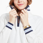 The Havelet Bay 1/4 Zip Ladies Jumper from Schoffel is a rather chic cotton knit, inspired by the iconic cricket jumper. The super soft cotton is woven in a chunky rib knit and cut in a classic fit for comfort, complete with a deep v-neck with quarter zip and contrasting trim to the cuffs, hem and inner collar.