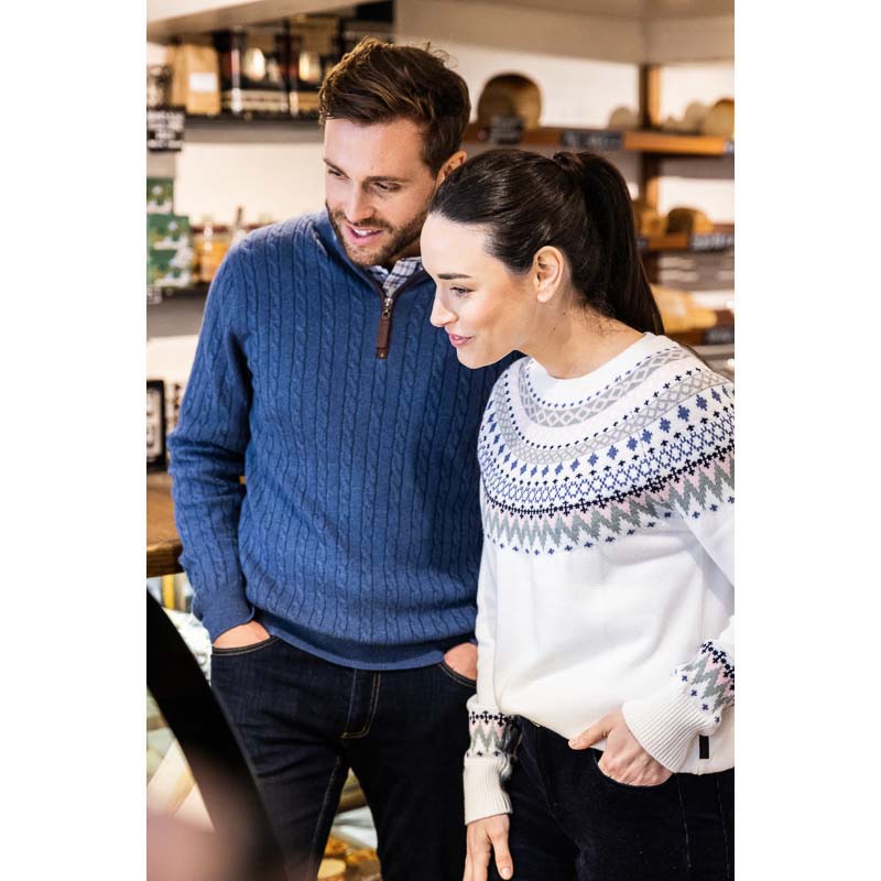 The Schoffel Shetland Fairisle Ladies Jumper provides a perfect combination of coziness and style. Composed of a luxuriously soft cotton blend, this regular fit garment displays a timeless crew neckline and an intricate Fairisle pattern on the chest and cuffs.