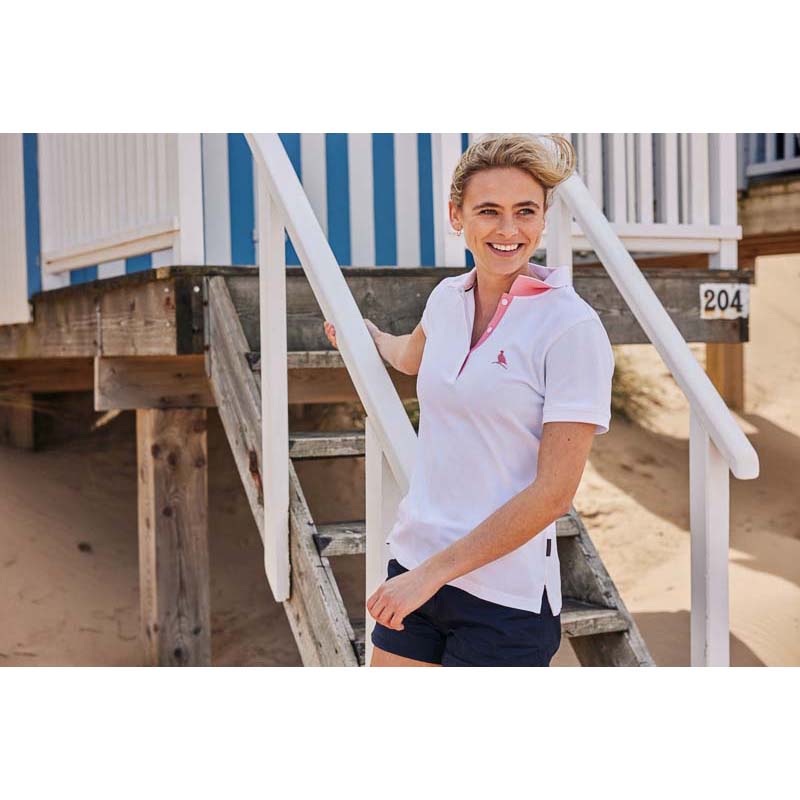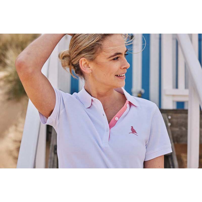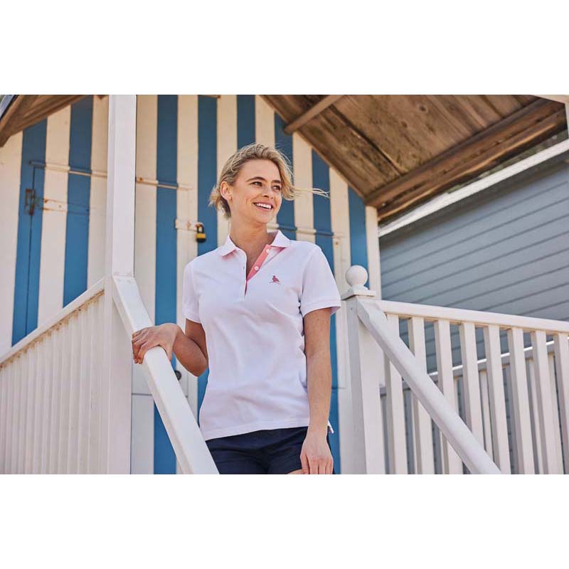 The Schoffel St Ives Tailored Ladies Polo Shirt is a comfortable and stylish option for those off-duty days through the summer. Pair with deck shoes, shorts, and a tote bag for an effortlessly cool look. The soft, textured cotton pique fabric is gently fitted for a feminine outline and features side vents at the hem, contrast piping, and embroidered ptarmigan logo.