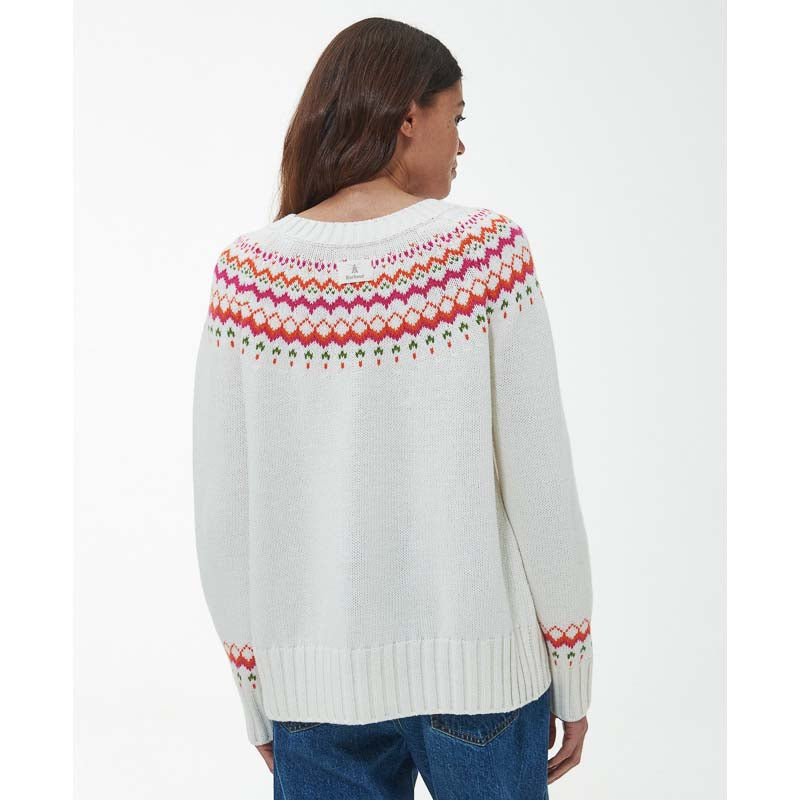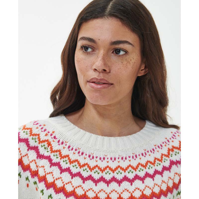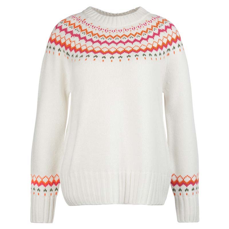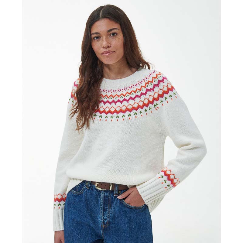 This Barbour Tidal Ladies Jumper is stylishly crafted with a Fairisle design on the front and back yoke and cuffs, full length raglan sleeves, and ribbed cuffs and hem. Made with a blend of cotton and wool this jumper ensures warmth and durability. Hand-wash at 30°C for best results. It's a classic piece that will last season after season, perfect for adding a touch of fun to any outfit.