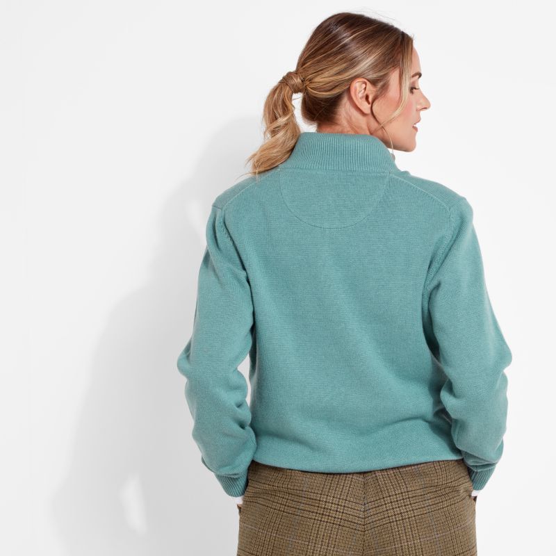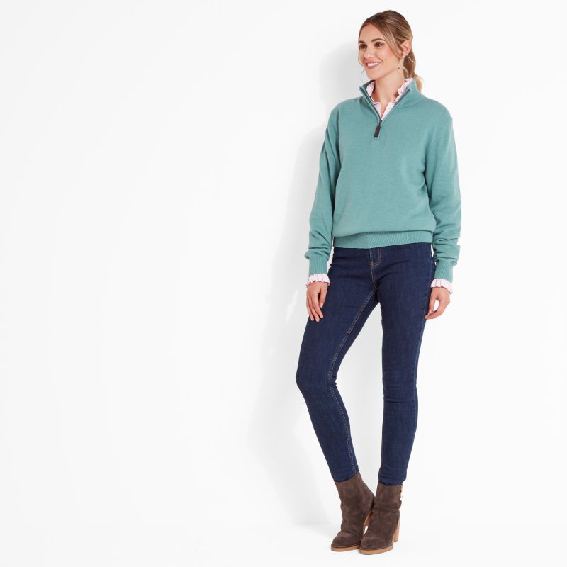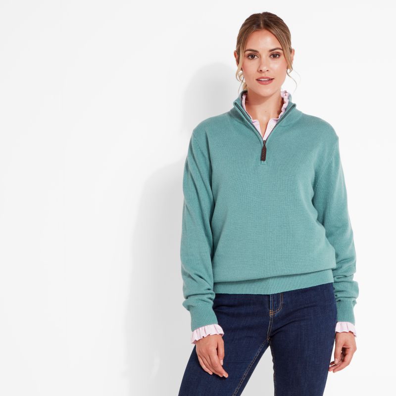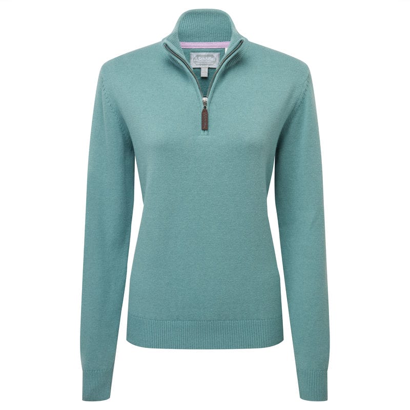 Stay warm in style with this Schoffel Pateley Ladies Jumper. The cotton and wool blend ensures it's both comfortable and durable. This popular quarter-zip design features a YKK zip with Schoffel branded pull. The ribbed collar, cuffs and hem give it a flattering fit. Perfect for all weather and occasions!
