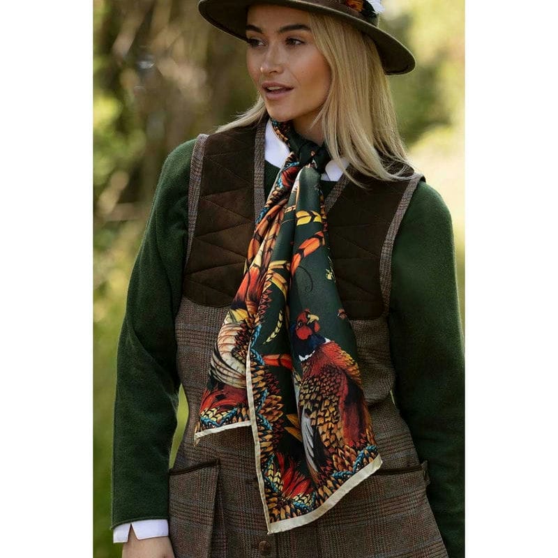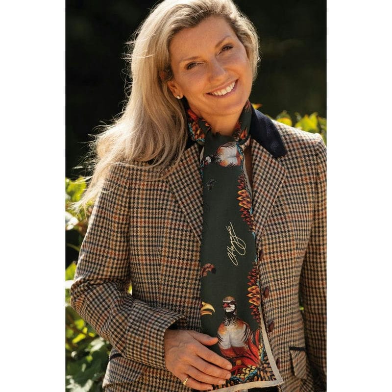 The Clare Haggas Heads or Tails Classic Twill Silk Scarf is crafted in England using the finest 100% pure silk twill with hand rolled edges. Featuring majestic cock pheasants with their flamboyant plumage, the rather dignified French partridge, and a glorious feather border, all displayed on a vibrant background, Heads or Tails makes a beautiful, lively design. The rich colour palette and luxurious depth of detail makes this scarf suitable for all occasions, whether you're dressing up or aiming for casual country style.