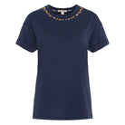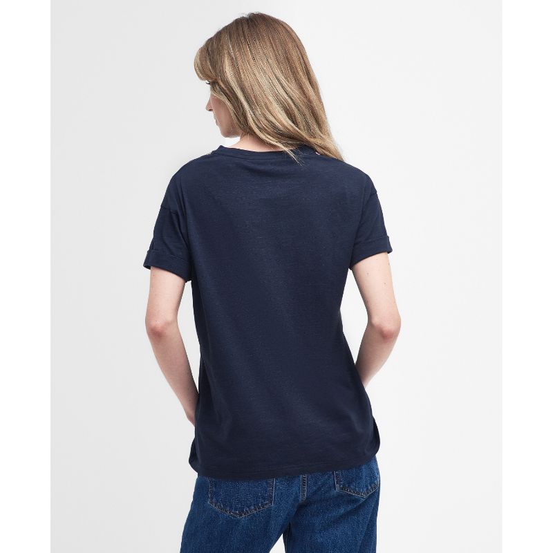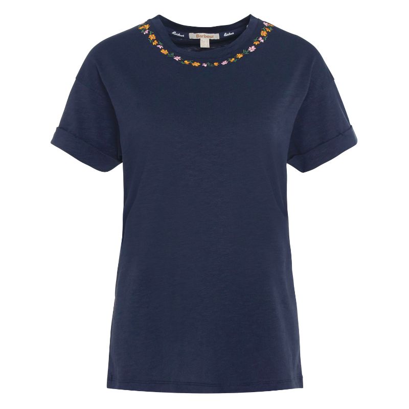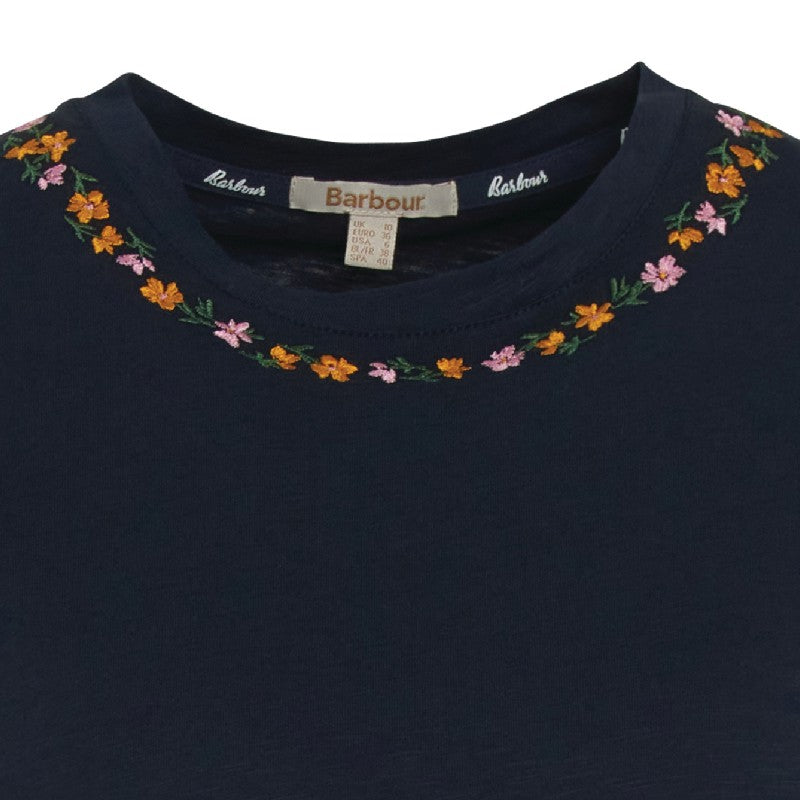 This Barbour Longfield T-Shirt is perfect for everyday elegance. Cut with a relaxed comfortable fit, the navy cotton slub fabric is both comfortable and breathable while the floral embroidery at the neckline adds a touch of feminine style. Perfect for casual days.