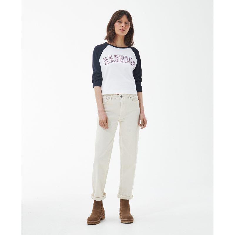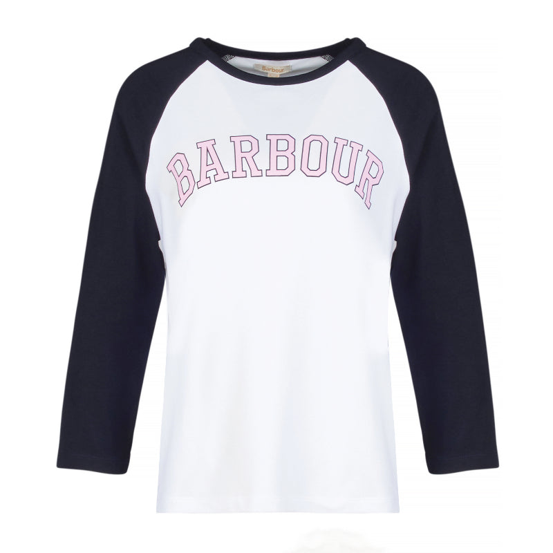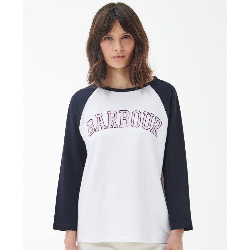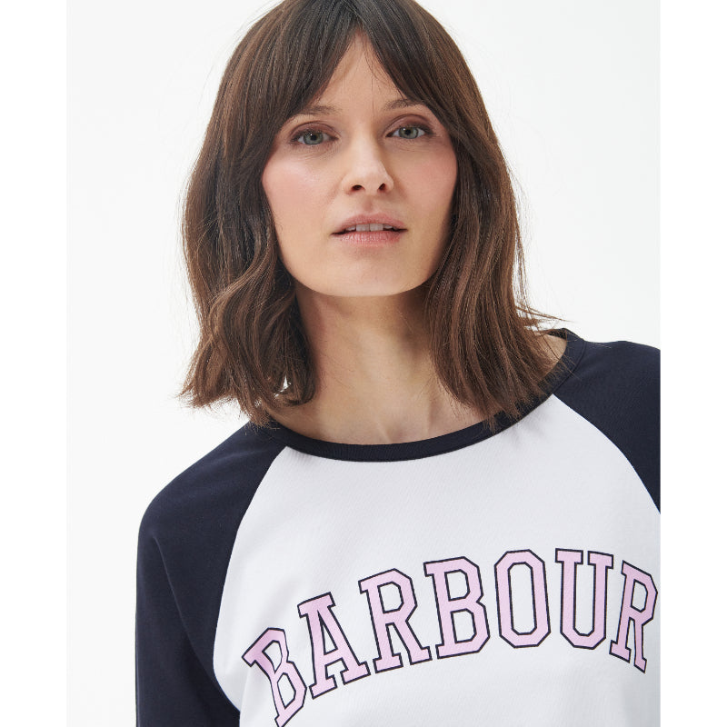 This Barbour Northumberland Ladies long sleeve T-Shirt is crafted from a stretch cotton blend for an extra soft feel and a better fit. The contrast raglan sleeves and neck trim, as well as the Barbour varsity printed graphic to the chest, add to the stylish design. Whether you're around the house or out and about, this t-shirt is sure to make a statement.