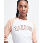 This Barbour Northumberland Ladies long sleeve T-Shirt is crafted from a stretch cotton blend for an extra soft feel and a better fit. The contrast raglan sleeves and neck trim, as well as the Barbour varsity printed graphic to the chest, add to the stylish design. Whether you're around the house or out and about, this t-shirt is sure to make a statement.