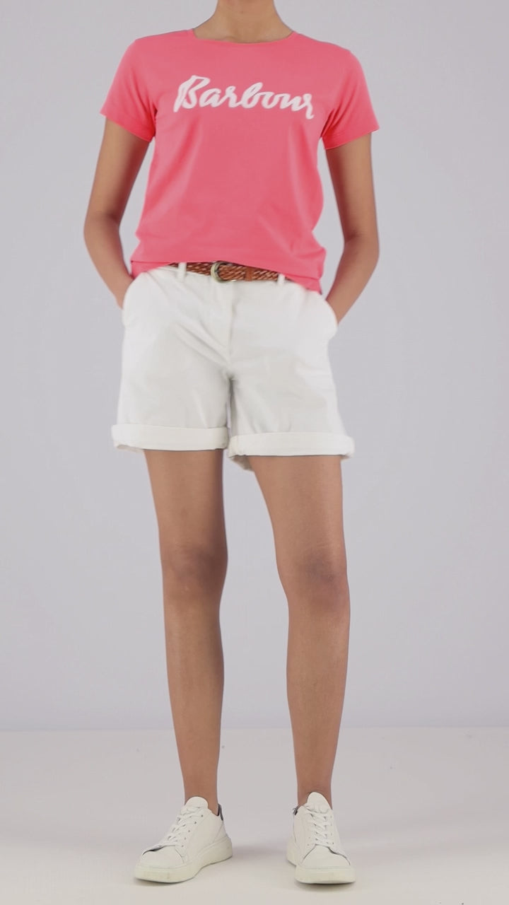 The Barbour Otterburn Ladies T-Shirt is classic, simple yet stylish with just the right amount of detail. The super soft cotton jersey is cut in a flattering, slim fit and crafted from sustainably sourced cotton with a touch of elastane for a comfortable stretch. Decorated with a flocked 'Barbour' script on the front.