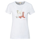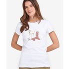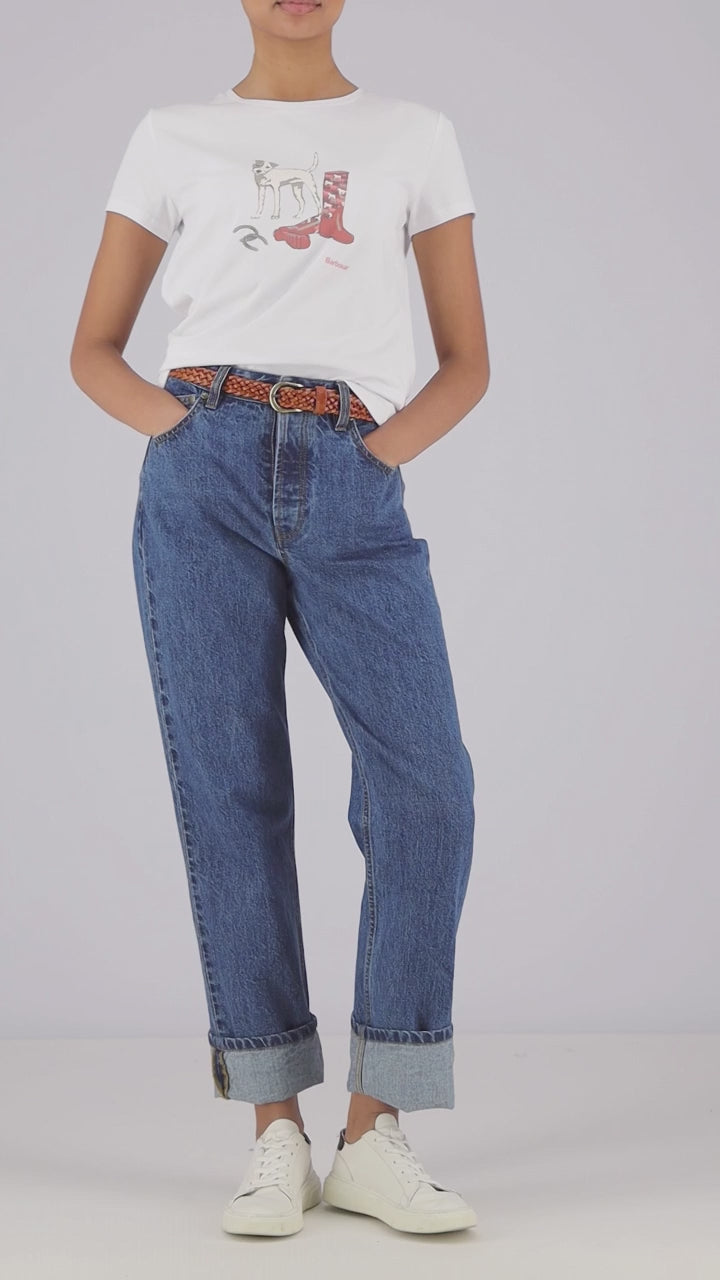 The Barbour Rowen Ladies T-Shirt is crafted from a beautifully soft, sustainably sourced cotton jersey featuring an adorable country print of a dog and wellies. Designed in a slim, flattering fit with a hint of elastane for added stretch and comfort. This tee is sure to become a staple of your summer wardrobe, ideal for sunny days or just as good for layering under Barbour knitwear in the colder months.