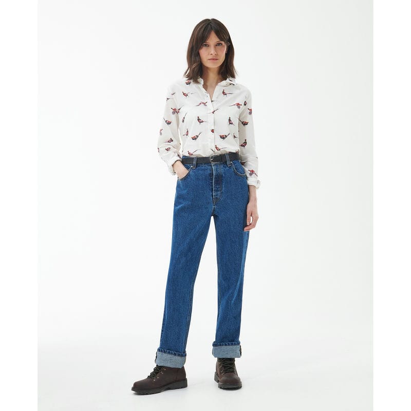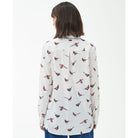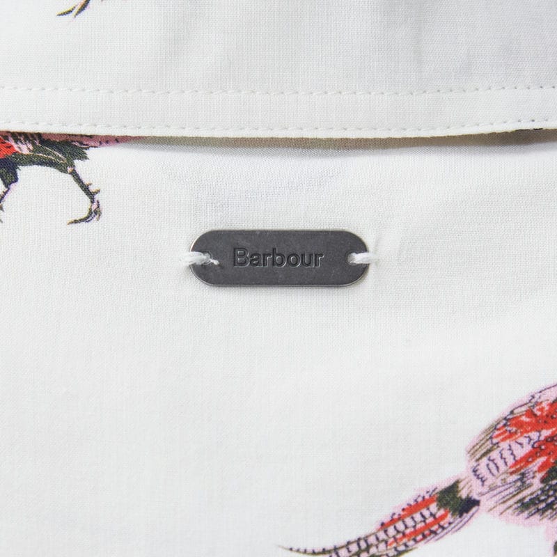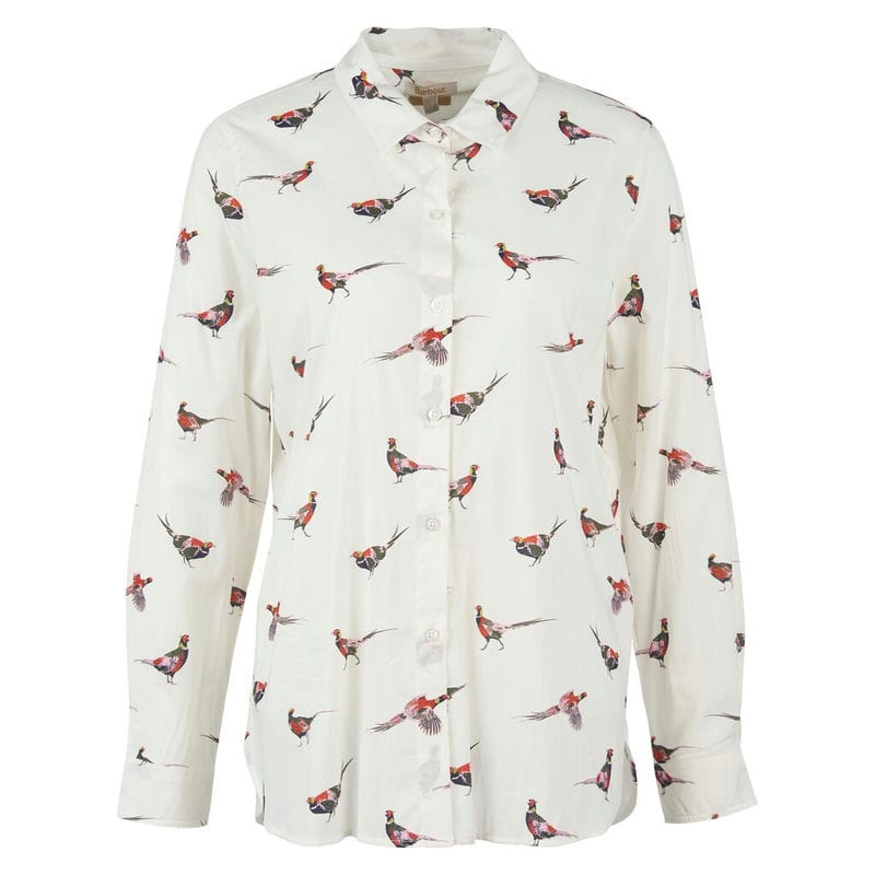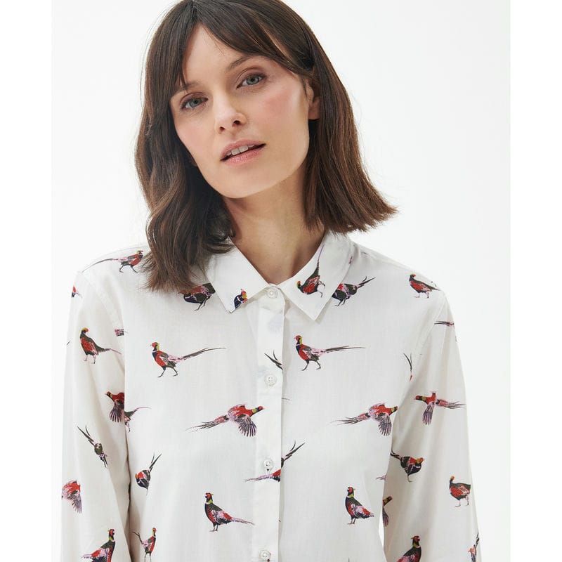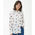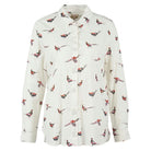 The Barbour Safari Ladies Shirt - Off White Country offers a comfortable fit and is adorned with a vivid all-over pheasant print design. It also features a curved hemline, double button cuff closure, and a Barbour branded label at the back of the neck. This timeless shirt is made of a breathable cotton-blend material.