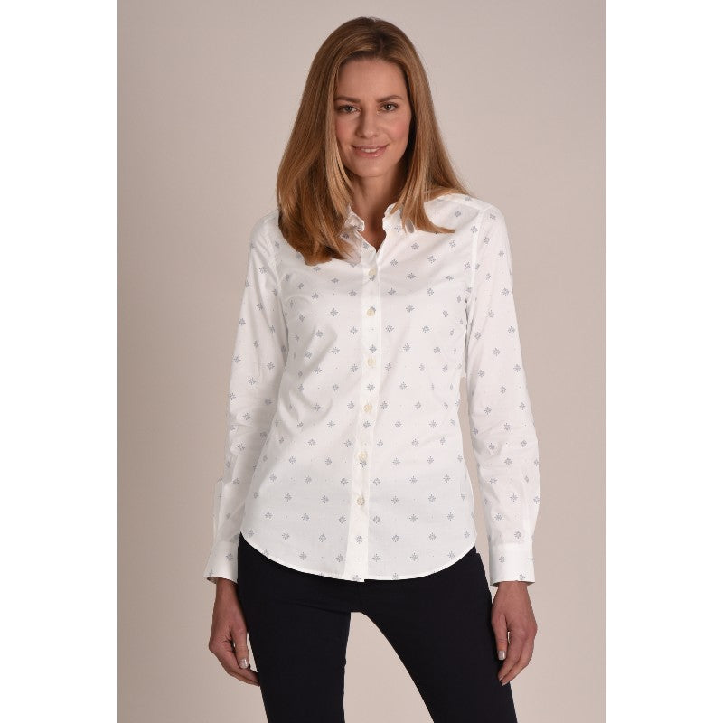 The Schoffel Ladies Norfolk Shirt is a luxurious addition to any wardrobe. Made from a soft cotton blend with added stretch, this shirt provides a skinny fitted silhouette and features a stunning hand-drawn digital print in seven different colorways. With a tailored fit, classic point collar, and single button cuffs, this machine-washable shirt is both bold and elegant. Perfect for both tucking in and leaving loose, it pairs beautifully with smart trousers for a chic and sophisticated look.