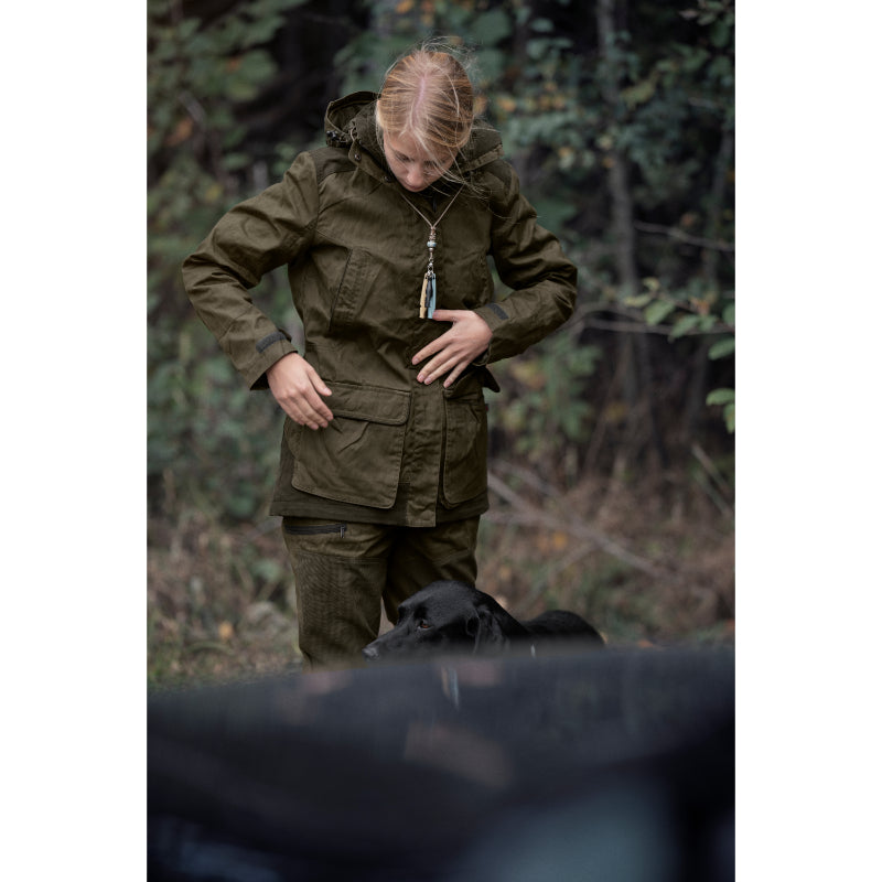 Seeland's Key-Point SEETEX Ladies Waterproof Jacket will keep the wearer comfortable and dry whatever the weather, due to the waterproof and breathable SEETEX 2-layer shell. The innovative outer is crafted from a waxed combination creating a noiseless finish which repels excess water and dirt. Shooting features include large cartridge pockets with drain holes and retainer straps for quick loading, fleece lined hand warmer pockets, zipped chest and an inner security pocket. The neat front placket covers the handy two-way front zip and the hood is completely detachable. An extremely practical, yet quiet jacket which is suitable for all outdoor and country pursuits.