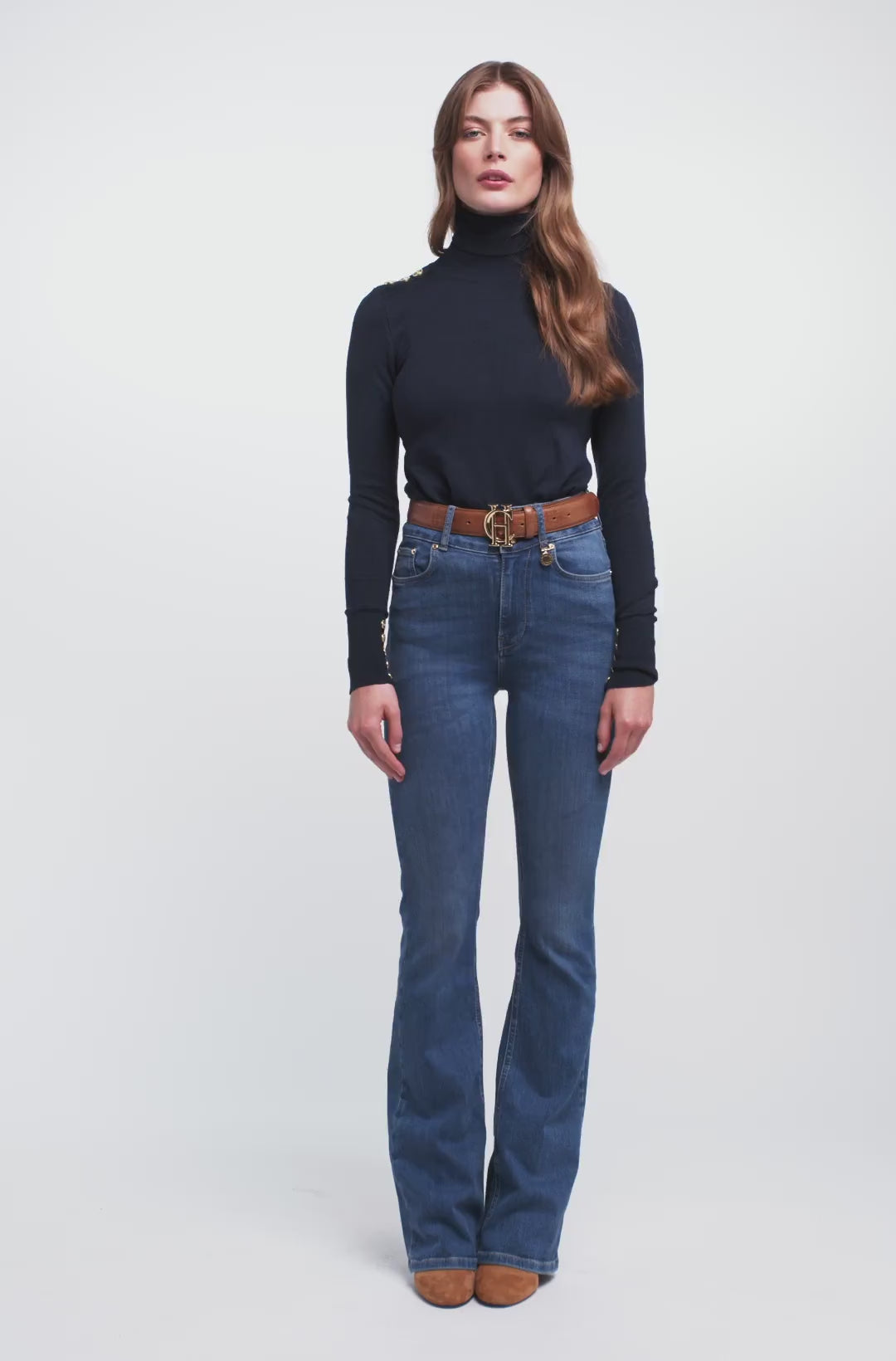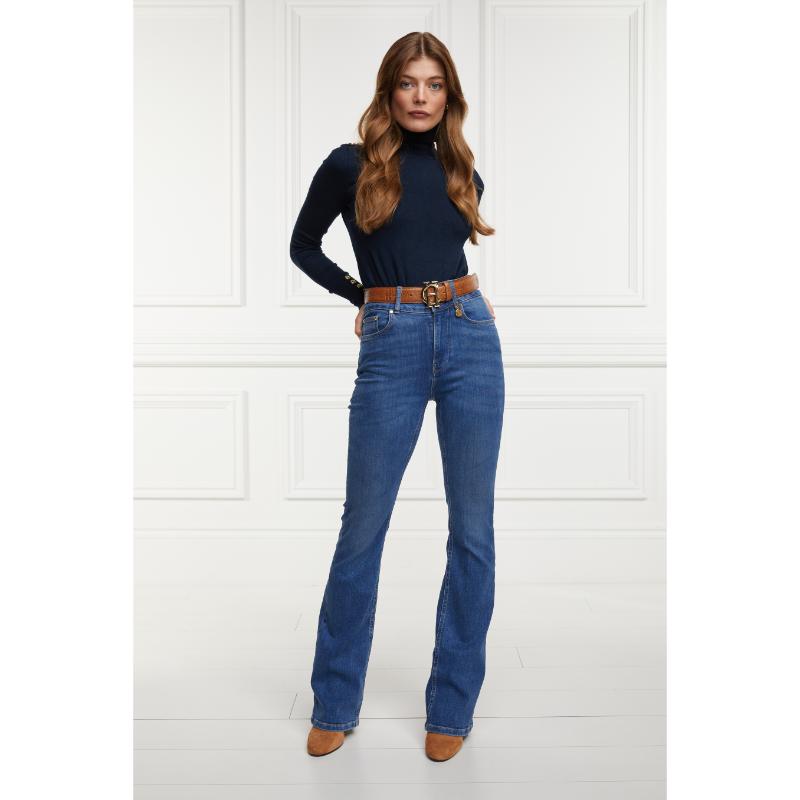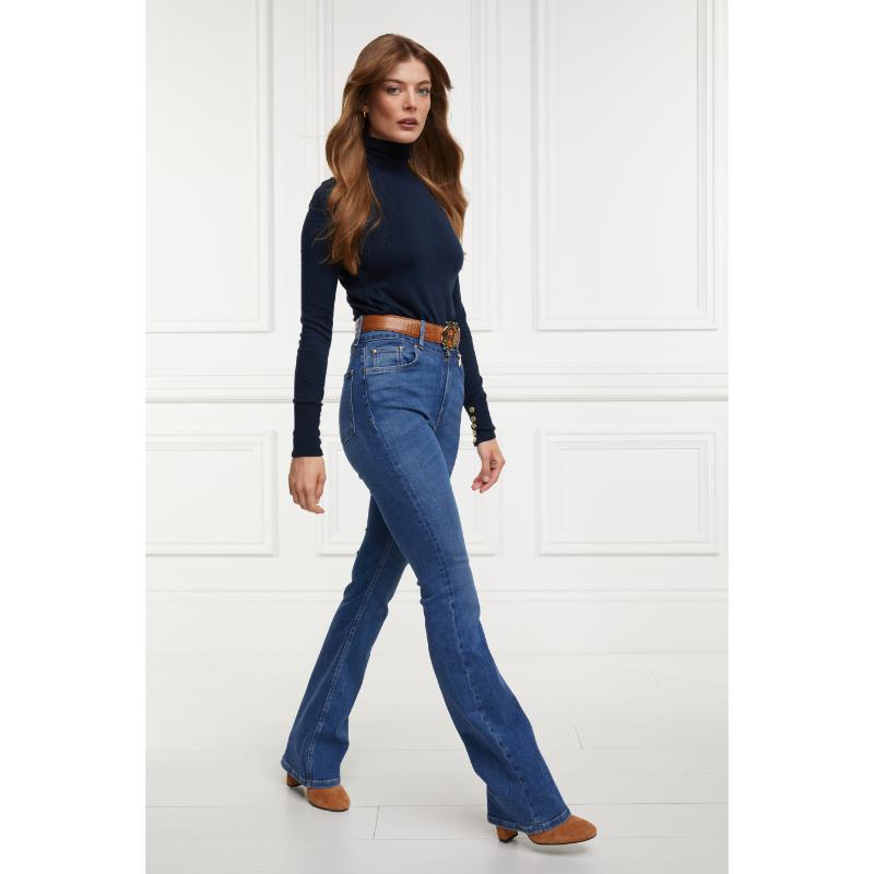 Introducing the Holland Cooper High Rise Flared Ladies Jeans. Designed with super soft, stretch denim and featuring a high-rise, fitted at the leg, they flick out into an elegant flare. Perfect for everyday looks, these jeans are detailed with signature crested hardware and a Holland Cooper coin charm. Plus, with colour fast technology and sculpting fabrics, these jeans are a must-have for any wardrobe.