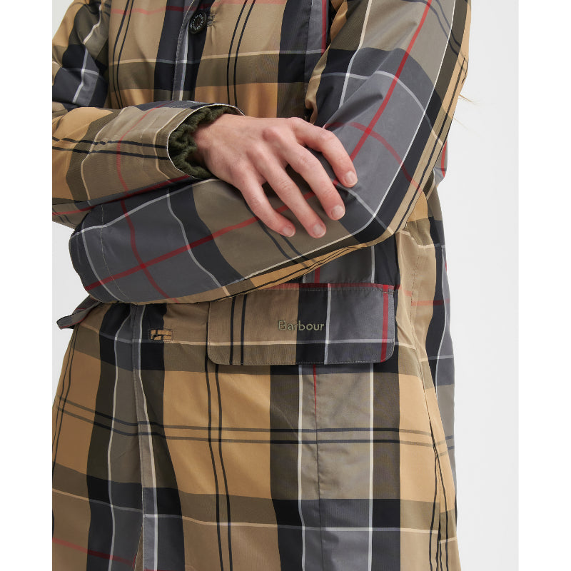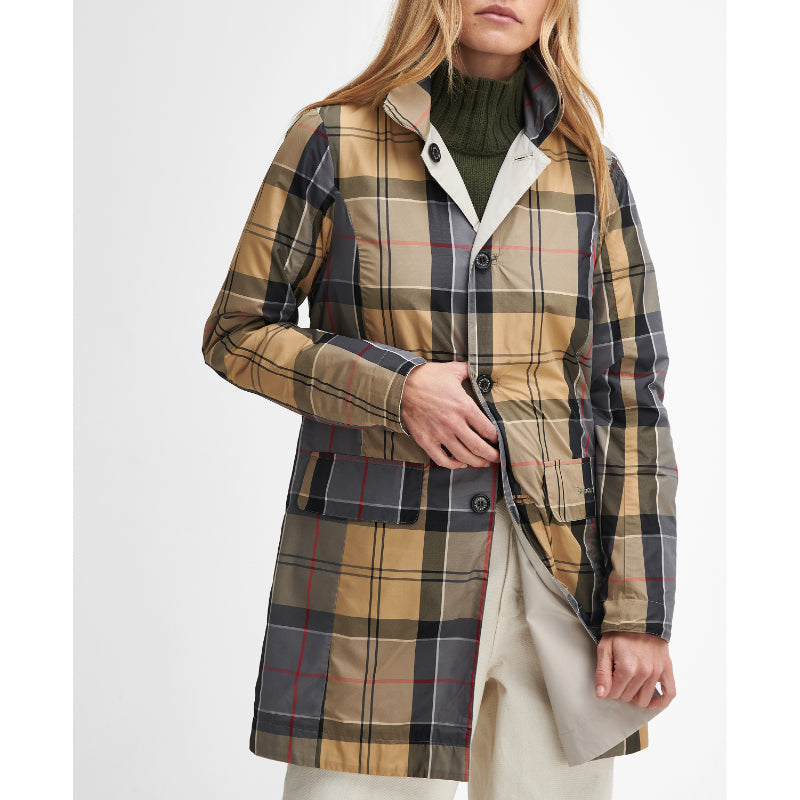 The Barbour Babbity Ladies Waterproof Jacket is a stylish and practical solution for outdoor wear. The solid colour and dress tartan combination creates a classic look. It is made from waterproof fabric, with a button front fastening and concealed in-seam pockets on the solid-colored side plus flap pockets on the tartan side. Easily reversible for different looks on different days.