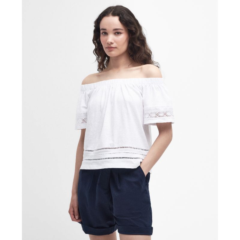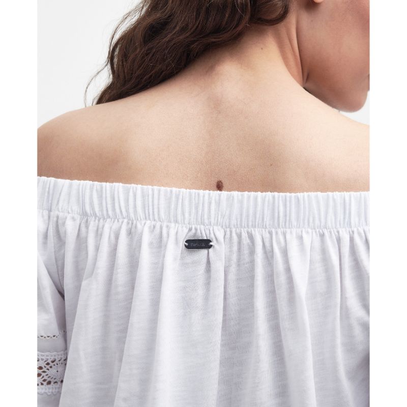 Stay cool this summer with the Barbour Ralee Ladies Top. Made from lightweight cotton, this relaxed fit bardot top features laddered trim details at the cuff and hem. Its wide neck can be worn on the shoulder or off the shoulders for an elegant effortless look. Style it with jeans and sandals for any casual summer or spring occasion.