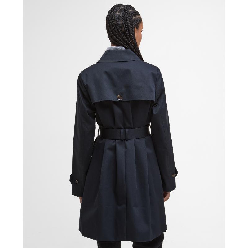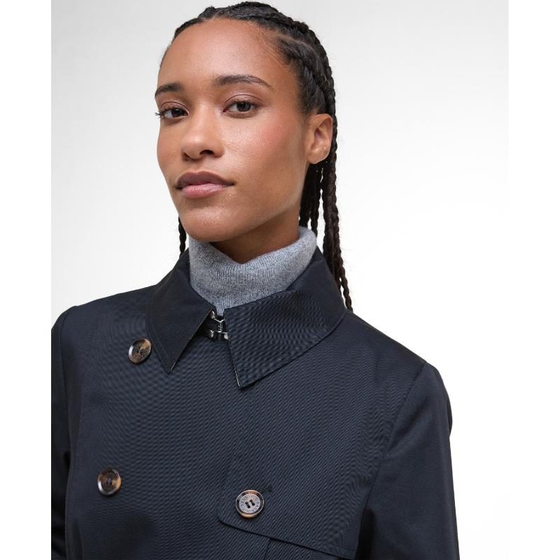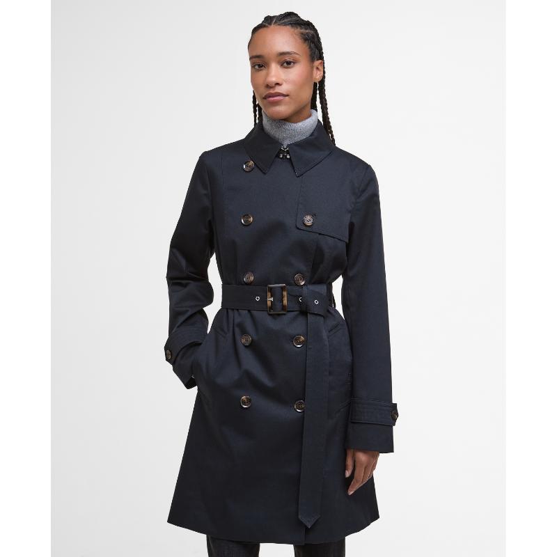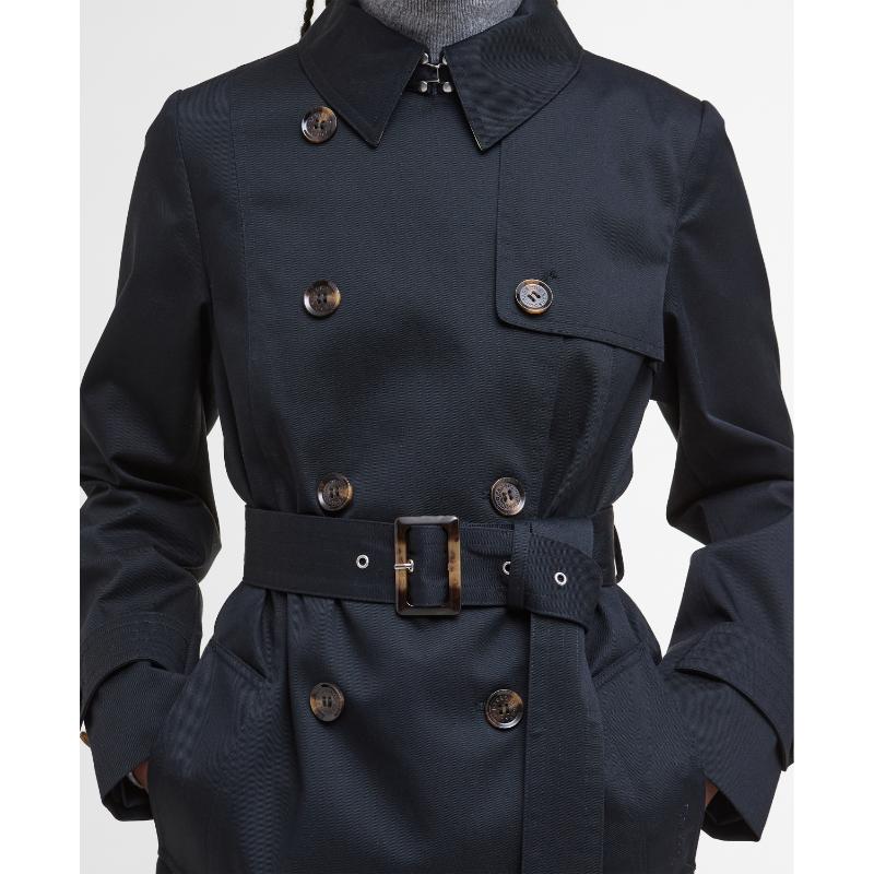The Barbour Short Greta Ladies Showerproof Trench is a mid-length, double breasted trench coat, cut to a tailored fit. Featuring a belted waist and mock horn trims, this polycotton twill trench coat has an attractive tartan lining that is sure to catch the eye as you move about town. Machine washable.