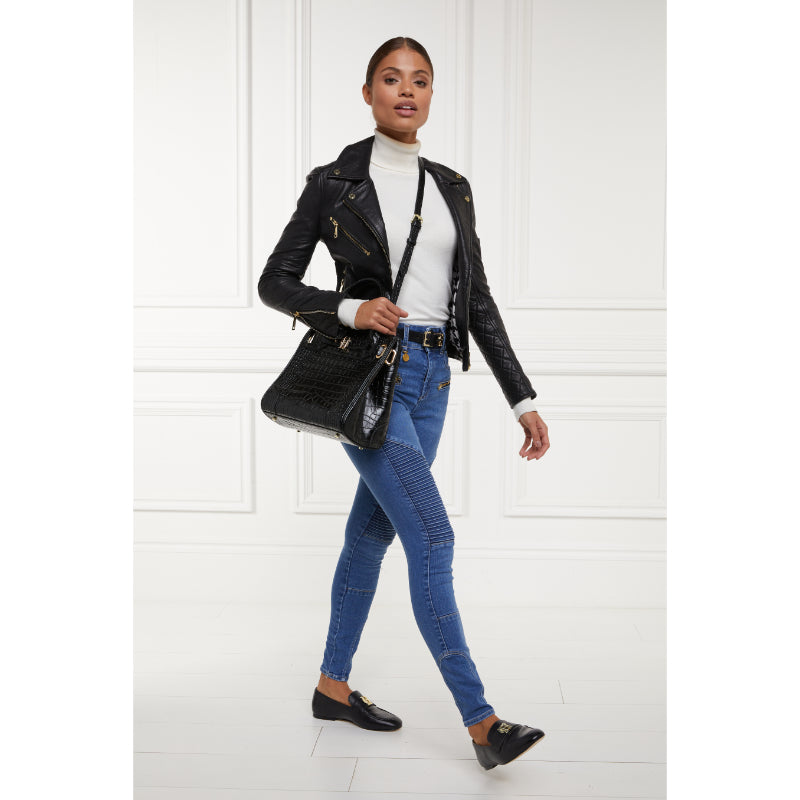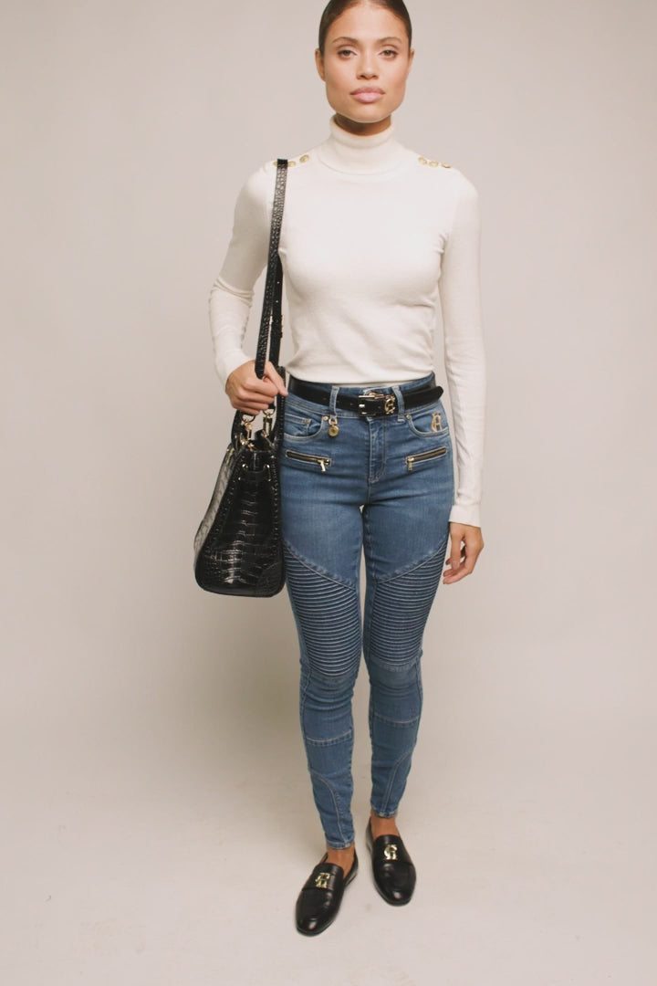The Holland Cooper Biker Ladies Jeans are ideal for when you want to add that extra stylish edge to your outfit. Crafted in a similar design to the incredibly popular HC Jodhpur Jeans, they are made from a quality cotton blend with a hint of elastane for stretch. Sitting high on the waist for a flattering slim fit, ideal for tucking your shirt or knitwear into and designed specifically not to cut in, providing comfort for all day wear. The pin-tuck biker panels on the legs and visible front pockets with high-shine zips are examples of Holland Cooper's exceptional attention to detail, making these so much more than just your average pair of jeans. Complete with a branded HC charm on the belt loop and high-density metallic embroidery.