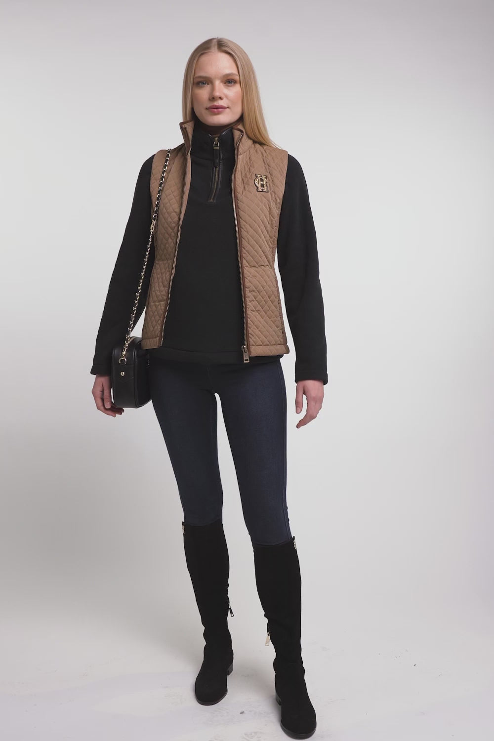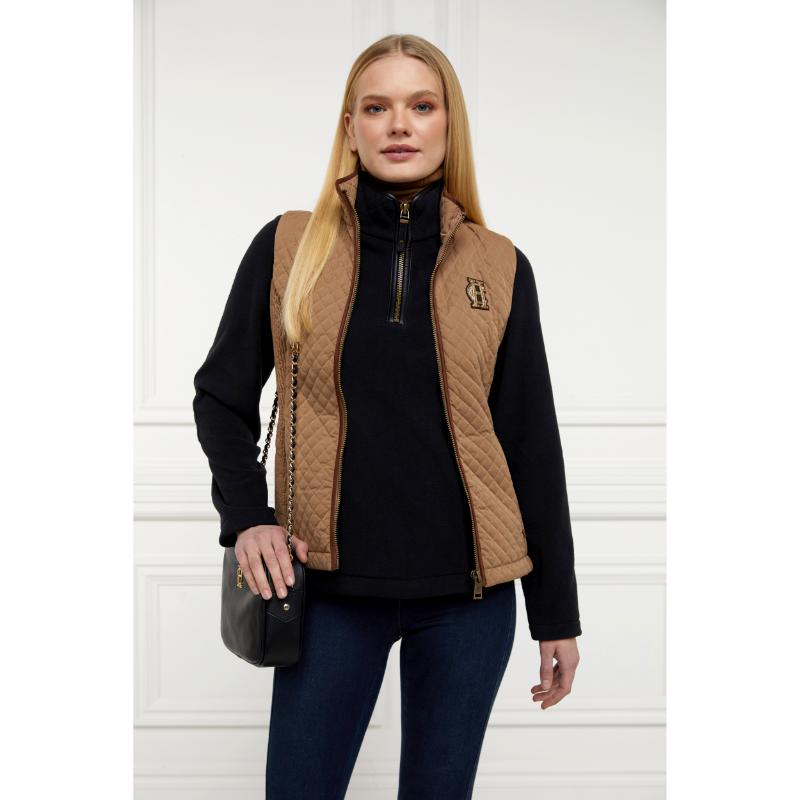 This Holland Cooper Country Ladies Fleece Quarter Zip Jumper is expertly constructed using technical polar fleece fabric for maximum warmth and comfort. Ideal for layering, it features contrasting faux leather piping detail, subtle HC embroidery on the chest, and unique quilted fleece elbow patches for enhanced comfort. The hidden seamed pockets provide a sleek and tailored fit whilst adding convenience. The finishing details include iconic Holland Cooper antique brass fastenings and metal hardware.